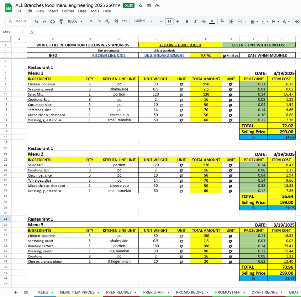รับทำ excel เมนู ใส่ สูตร ต้นทุน ราคา อาหาร เครื่องดื่ม engineering โดยเชฟผู้เชี่ยวชาญ มากกว่า 15 ปี