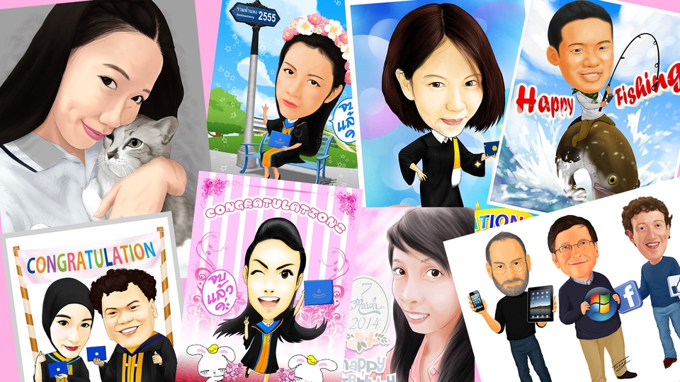 รับวาดภาพเหมือนภาพล้อ เพื่อเป็นของขวัญในโอกาสต่างๆ รับปริญญา วันเกิด งานแต่ง โดยลูกค้าจะได้งานเป็น ไฟล์ภาพ ดิจิตอล 300 dpi (ส่งมอบเป็นไฟล์เท่านั้น) รายละเอียดข้อตกลง - ลูกค้าจะต้องส่งข้อมูลให้ครบถ้วน และบอกสไตล์งานที่ต้องการให้ฟรีแลนซ์เข้าใจ - ภาพที่ส่งให้ฟรีแลนท์วาดต้องเป็นภาพที่มีใบหน้าชัดเจน - ฟรีแลนซ์จะส่งความคืบหน้าให้ดูอย่างสม่ำเสมอ - ส่งงานตามกำหนด ขั้นตอนการทำงาน 1. รับออเดอร์ พร้อมข้อมูลการทำงาน ทำความเข้าใจรายละเอียด 2. ฟรีแลนซ์เสนอราคางาน 3. ลูกชำระเงินค่าว่าจ้าง ตามขั้นตอนเว็บไซต์ 4. เริ่มงานตามที่ตกลงกันไว้ 5. แก้ไขตามข้อตกลง จนจบงาน