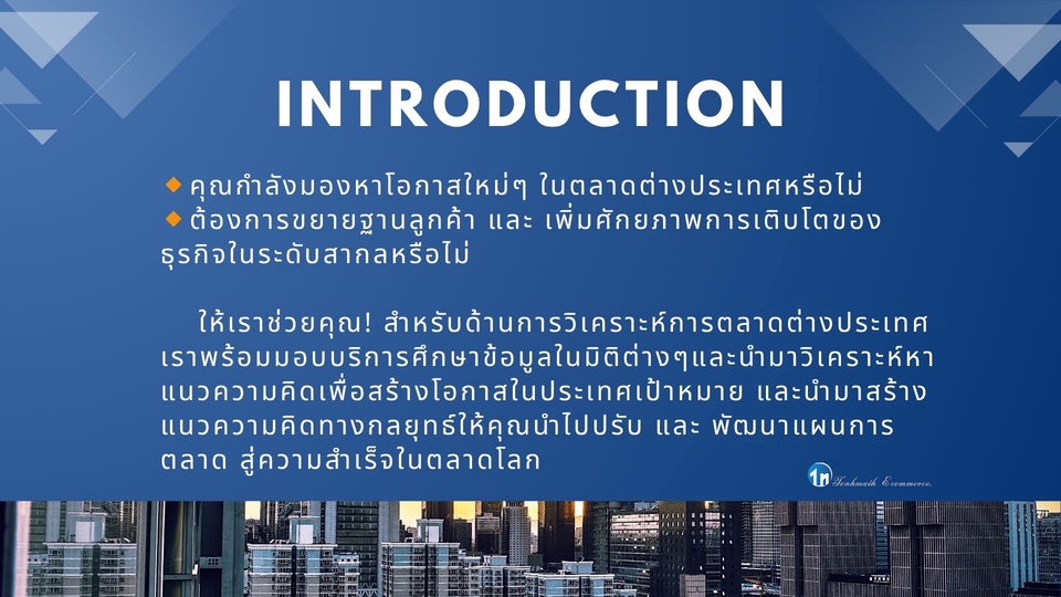 ขยายธุรกิจสู่ตลาดโลกอย่างมั่นใจ ด้วยบริการวิเคราะห์การตลาดระหว่างประเทศครบวงจร : คุณกำลังมองหาโอกาสใหม่ๆ ในตลาดต่างประเทศหรือไม่ และ ต้องการขยายฐานลูกค้าและเพิ่มศักยภาพการเติบโตของธุรกิจในระดับสากล ให้เราช่วยคุณด้านการวิเคราะห์การตลาดระหว่างประเทศ เราพร้อมมอบบริการที่ปรึกษาและวิเคราะห์เชิงกลยุทธ์ เพื่อนำทางธุรกิจของคุณสู่ความสำเร็จในตลาดโลก : บริการของเราครอบคลุม ดังนี้ 1.การวิเคราะห์ศักยภาพตลาดท้องถิ่นต่างประเทศ: ระบุและประเมินประเทศที่มีศักยภาพในการลงทุน โดยพิจารณาจากปัจจัยทางเศรษฐกิจ สังคม การเมือง เทคโนโลยี และกฎหมาย และเครื่องมือวิเคราะห์อื่นๆที่เหมาะสม 2.การวิเคราะห์โอกาสทางการตลาดท้องถิ่นต่างประเทศ : เจาะลึกเทรนด์และความต้องการของผู้บริโภคในตลาดเป้าหมาย วิเคราะห์คู่แข่ง ประเมินขนาดตลาด และระบุช่องทางการตลาดที่มีประสิทธิภาพ 3.การประเมินความเสี่ยงและอุปสรรค: วิเคราะห์ความเสี่ยงทางธุรกิจ กฎระเบียบทางการค้า วัฒนธรรมที่แตกต่าง และอุปสรรคอื่นๆ ที่อาจเกิดขึ้นในการดำเนินธุรกิจระหว่างประเทศ 4.การสร้างแผนกลยุทธ์การเข้าสู่ตลาด : ออกแบบกลยุทธ์ที่เหมาะสมสำหรับการเข้าสู่ตลาดทั้งเป้าหมายในท้องถิ่น และ กลยุทธ์แบบGobal 5.รายงานสรุปศักยภาพและกลยุทธ์ของตลาดต่างประเทศเป้าหมายเชิงเปรียบเทียบ และประเมินประเทศที่ได้รับประโยชน์สูงสุด 6.บริการอื่นๆ อันเกี่ยวข้องกับการวิเคราะห์ประเทศเพิ่มเติม ขั้นตอนการทำงาน 1. เริ่มต้นทำข้อตกลงสำหรับความต้องการของลูกค้าเกี่ยวกับรูปแบบการลงทุนและลักษณะของประเทศเป้าหมายที่ต้องการ เพื่อนำข้อมูลมาประกอบการวิเคราะห์หาประเทศที่สนใจ รวมถึงขอบเขตของงาน (ในขั้นตอนนี้ลูกค้าไม่เสียค่าใช้จ่าย) 2. เสนอราคาผ่านระบบ และชำระเงินผ่านระบบเพื่อยืนยันการเริ่มงาน 3. ลูกค้าเตรียมข้อมูลที่จำเป็นเช่น รายละเอียดสินค้าหรือบริการ ข้อมูลเบื้องต้นในองค์กร เพื่อนำไปวิเคราะห์จุดแข็ง จุดอ่อน และเครื่องมือสำหรับการวิเคราะห์อื่นๆตามความเหมาะสม เป็นต้น 4. ดำเนินงานตามกระบวนการทำงาน 5. ส่งมอบงาน และ ตรวจสอบ 6. ส่งมอบงาน และ ตรวจสอบหลังจากแก้ไขงานครั้งที่ 2-4 และอนุมัติงาน