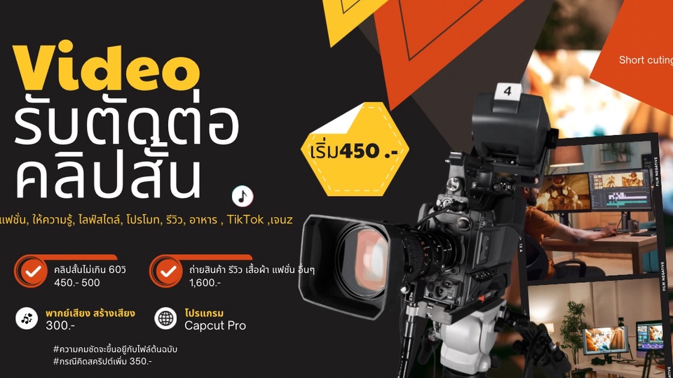 *ตัดต่อวิดีโอราคาเริ่มต้นที่ 350-500.-📸✨ ความยาวของคลิป 0-1 นาที -เฉพาะพากย์เสียงเริ่มต้น 350 บาท ไม่เกิน 2 นาที -ได้ไฟล์คลิป 4K -ส่งงานผ่าน google Drive -ตัดต่อ CapCut Pro - ซับตามคำพูด (ภาษาไทย) เพิ่มราคา 300.- (ไม่เกิน 5 นาที) -สามารถแก้งานได้ไม่เกิน 2 ครั้ง (กรณีที่แก้ไขเกิน คิดครั้งละ 100 บาท) —————————รูปแบบคลิปที่ทำ—————————— เที่ยว ให้ความรู้ TikTok vlog คลิกความงาม เกมเพื่อน ทางการ กระชับน่าสนใจ ตลก *รับทำเรซูเม่ 200 บาท -มีข้อมูลทุกอย่างมาให้พร้อมวางเรฟมาให้ เช่นสี โทน ฟอนต์ -แก้ไขได้ได้2ครั้ง ครั้งต่อไป 100.- #ผลงานสามารถทักสอบถามได้ก่อนเลยนะค้าบ มี TikTok ส่วนตัวและบริษัท #ประสบการณ์ทำงานสายอาชีพ content creator 2ปี ตัดต่อคลิป 2ปี ขั้นตอนการทำงาน 1. ติดต่อสอบถามเพิ่มเติมเพื่อพูดคุยตกลงความเข้าใจ 2. อธิบายเรทราคา ข้อมูล เรฟ และเงื่อนไขให้ทราบ ก่อนตกลงงาน 3. เรทราคาอยู่ที่การพูดคุยระหว่างผู้ว่าจ้าง ขั้นต่ำ200 4. ตกลงว่าจ้างเริ่มงาน กรณีงานตัดต่อเรียบร้อนเหลือใส่เอฟเฟค ซาวด์ ให้น่าสนใจ 350.- กรณีไฟล์ดิบไม่ผ่านการตัดต่อ 500.-