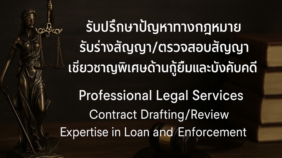 นักกฎหมายประสบการณ์ 10ปี - ปรึกษาทั่วไป ได้ทุกเรื่อง - รับร่างสัญญา/ตรวจ - เชี่ยวชาญเกี่ยวกับเรื่องหนี้ กู้ยืม จำนอง จำนำ - เชี่ยวชาญ การบังคับคดี ยึดทรัพย์ ขายทอดตลาด