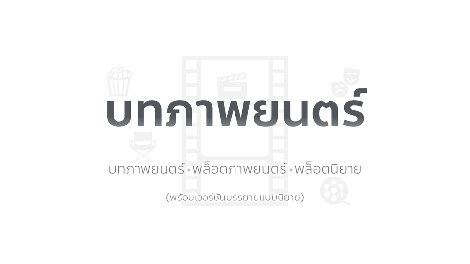 บทภาพยนตร์ พล็อตนิยาย เรื่องสั้น บทกลอน บทมิวสิควิดีโอ บทละครเพลง บทโฆษณา - แนวโรแมนติก ดราม่า - แนววาย - แนวตลกล้อเลียน - วรรณกรรมเยาวชน - ศาสนาและความเชื่อ - สืบสวนสอบสวน - เรื่องลี้ลับ สยองขวัญ - ย้อนยุค - ประเพณีอีสาน ขั้นตอนการทำงาน 1. ลูกค้าส่งรายละเอียดงานและวันเวลา 2. ประเมินราคาและตกลงราคาพร้อมออกใบเสนอราคาให้ลูกค้า 3. เริ่มเขียนพล็อตและส่งให้ลูกค้าตรวจ 4. เริ่มเขียนบทและส่งให้ลูกค้าตรวจ 5. แก้ไขงานตามคำแนะนำของลูกค้า 6. ส่งงาน