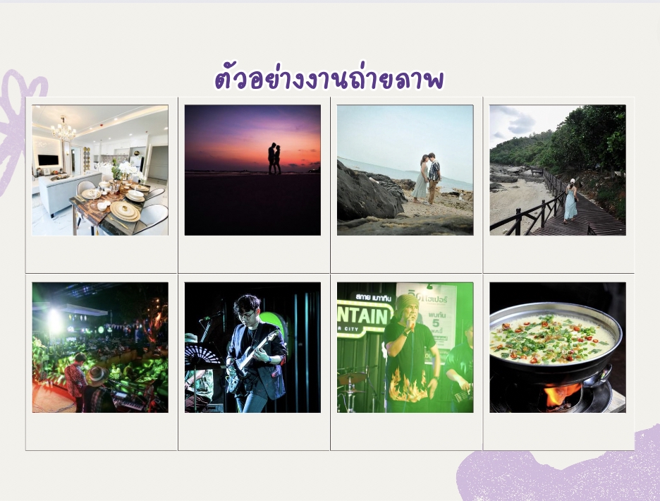 ช่างภาพ รับถ่ายภาพ ด้วยกล้องและเลนส์คุณภาพดี -ชำนาญการถ่ายภาพสินค้า อาหาร บุคคล -ชำนาญการถ่ายภาพสถานที่ต่างๆ เช่น ร้านอาหาร ร้านกาแฟ คาเฟ่ คอนโด บ้าน พูลวิลล่า -ชำนาญการถ่ายภาพบรรยากาศในงานสำคัญ อีเวนท์ คอนเสิร์ต งานแต่ง งานวันเกิด และโอกาสสำคัญต่างๆ ขั้นตอนการทำงาน 1. คุยรายละเอียด ลูกค้าบรีฟงาน ทำความเข้าใจบรีฟ 2. ตกลงจ้างงาน กำหนดวันส่งงาน ชำระค่าใช้จ่าย 3. เริ่มทำงาน และส่งงานให้ตรวจตามที่ตกลงกันไว้