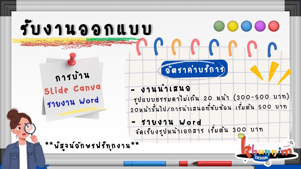 นักศึกษาปริญญาตรี มีความคิดสร้างสรรค์ พร้อมเรียนรู้สิ่งใหม่ๆ ชอบทำงานกราฟฟิก โดยเฉพาะงานโปสเตอร์ นำเสนอ และตกแต่งอื่นๆ