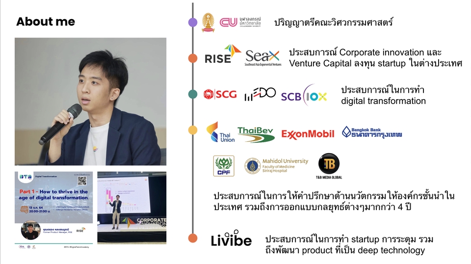 ที่ปรึกษาด้านนวัตกรรม และกลยุทธ์ให้กับองค์กรขนาดใหญ่ ในประเทศทั้งในด้าน business transformation, corporate innovation และ marketing รวมถึงประสบการณ์สร้าง และระดมทุน startup รับงานสอนด้านธุรกิจ และ startup , innovation และให้คำปรึกษาด้านธุรกิจ เขียนแผนธุรกิจครับ
