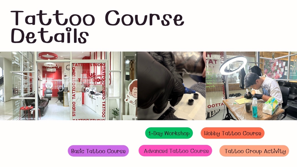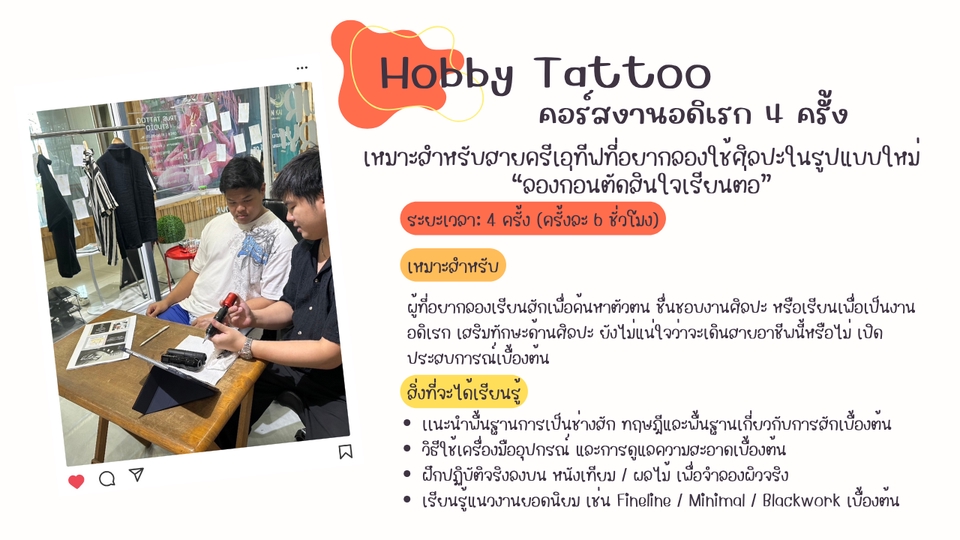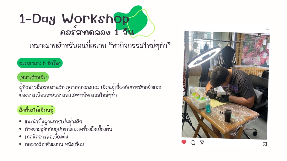 ฿1,490เหมาะมากสำหรับ ผู้ที่ชื่นชอบศิลปะ งานสัก อยากทดลอง และเข้าใจเบื้องต้นเกี่ยวกับกระบวนการสัก สิ่งที่ได้เรียนรู้ - พื้นฐานการเป็นช่าง - ทำความรู้จักอุปกรณ์เบื้องต้น - ทดลองสักจริงบนหนังเทียม