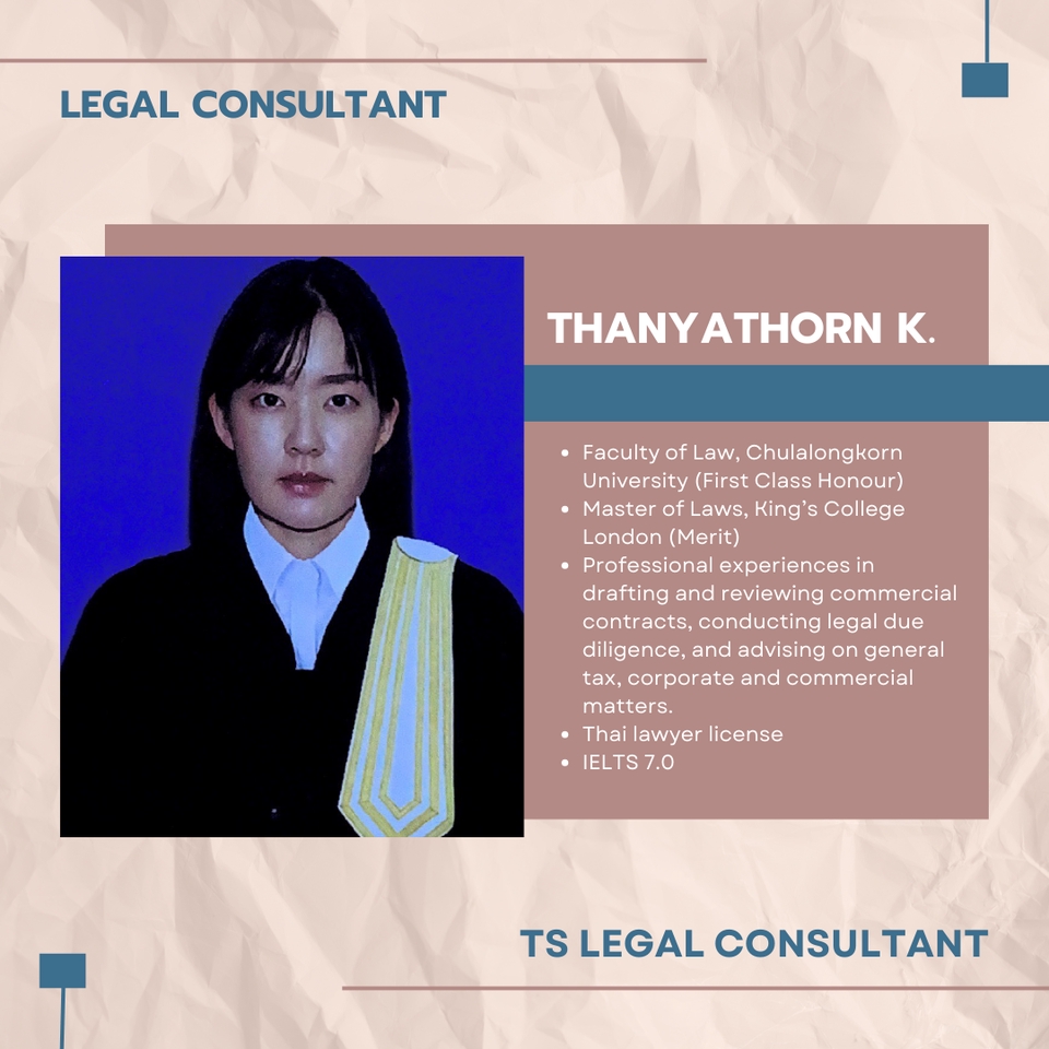 ให้บริการงานด้านที่ปรึกษากฎหมายโดยทนาย 2 ท่าน มีประสบการณ์การทำงานในบริษัทที่ปรึกษากฎหมายชั้นนำ (international law firm) มากกว่า 3 ปีขึ้นไป ด้านกฎหมายธุรกิจ ร่างสัญญา M&A และอื่นๆ ที่ปรึกษาทั้งสองท่านจบการศึกษาจากคณะนิติศาสตร์ จุฬาลงกรณ์มหาวิทยาลัย และ มหาวิทยาลัยธรรมศาสตร์ (เกียรตินิยมอันดับหนึ่ง) ปริญญาโท Major of Laws (LL.M.), King's College London (Merit) IELTS - 7.0