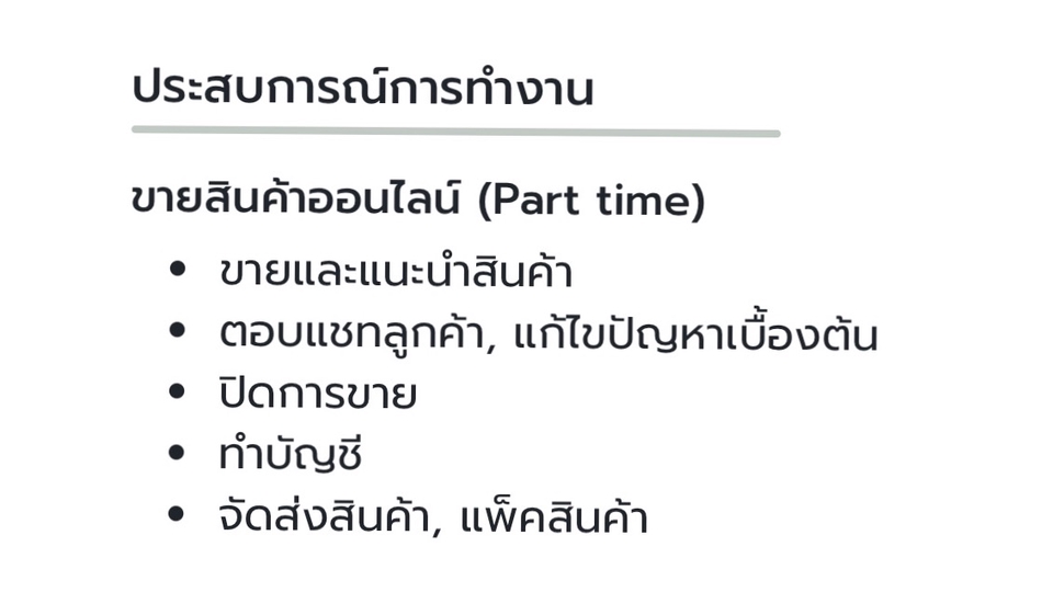 สวัสดีค่ะ มีประสบการ์ณพาร์ทไทม์แอดมินเพจขายโทรศัพท์มาก่อน สามารถแนะนำสินค้า และใช้ภาษาไทยได้อย่างถูกต้องค่ะ
