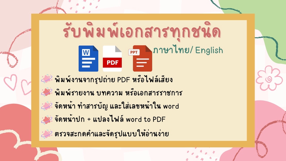 🌻บริการ - พิมพ์งานจากรูปถ่าย PDF หรือไฟล์เสียง - พิมพ์รายงาน บทความ หรือเอกสารราชการ - จัดหน้าปก + แปลงไฟล์ word to PDF พร้อมส่ง - ตรวจสะกดคำและจัดรูปแบบให้อ่านง่าย 🕔ระยะเวลาทำงาน 1-3 วัน (ขึ้นอยู่กับจำนวนหน้า) 💾 ขั้นตอนการทำงาน - ลูกค้าแจ้งรายละเอียดข้อมูลและตัวงาน - ลูกค้าและทางเราจะตกลงราคากันค่ะ - ลูกค้าส่งไฟล์หรือข้อมูลที่ต้องการจากพิมพ์ในทางเรา - ทางเราจะเริ่มทำงานหลังยืนยันการจ้างงาน และลูกค้าสามารถแก้งานได้ 2 ครั้ง - ส่งมอบไฟล์งานต้ PDF หรือไฟล์งานลูกค้าต้องการ