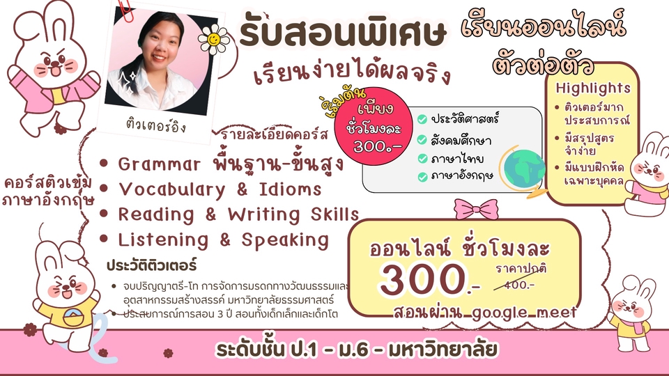 รับสอนพิเศษภาษาไทย - เรียนออนไลน์ตัวต่อตัว สวัสดีค่ะ รับสอนภาษาไทยแบบตัวต่อตัว พร้อมช่วยให้น้อง ๆ เข้าใจและรักวิชาภาษาไทยมากขึ้น 📚 คอร์สสอนครอบคลุม: การอ่าน อ่านออกเสียง สะกดคำ การเขียน คำประสม อักขรวิธี ไวยากรณ์ไทย ชนิดของคำ การใช้ภาษา วรรณคดี วิเคราะห์เนื้อเรื่อง ตีความ เทคนิคทำข้อสอบ O-NET, GAT, 9 วิชาสามัญ ✨ จุดเด่นของการเรียน: สอนแบบเข้าใจง่าย ไม่ท่องจำตาย มีสรุปสูตรลัด เทคนิคจดจำ แบบฝึกหัดเฉพาะบุคคลตามจุดอ่อน ติดตามผลการเรียนอย่างใกล้ชิด ใช้ตัวอย่างจากชีวิตประจำวันให้เข้าใจง่าย 🎯 เหมาะสำหรับ: นักเรียนระดับ ป.1 - ม.6 ผู้ที่ต้องการยกระดับคะแนนสอบ ผู้ที่อ่อนพื้นฐานต้องการเสริมสร้าง ผู้ที่ต้องการเตรียมสอบเข้ามหาวิทยาลัย 💰 อัตราค่าเรียน: เพียง 300 บาท/ชั่วโมง 📱 รูปแบบการสอน: สอนผ่านออนไลน์ Google Meet สะดวก ปลอดภัย เรียนได้ที่บ้าน มุ่งมั่นที่จะทำให้ภาษาไทยเป็นวิชาที่สนุกและเข้าใจง่ายสำหรับทุกคนค่ะ