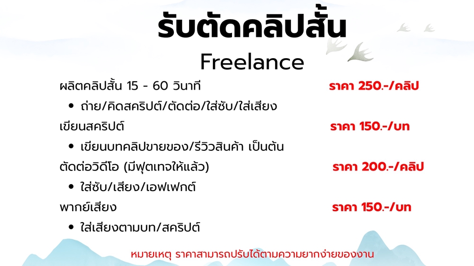 ฿2,000ผลิตคลิปสั้น 15 - 60 วินาที - ถ่าย/คิดสคริปต์/ตัดต่อ/ใส่ซับ/ใส่เสียง