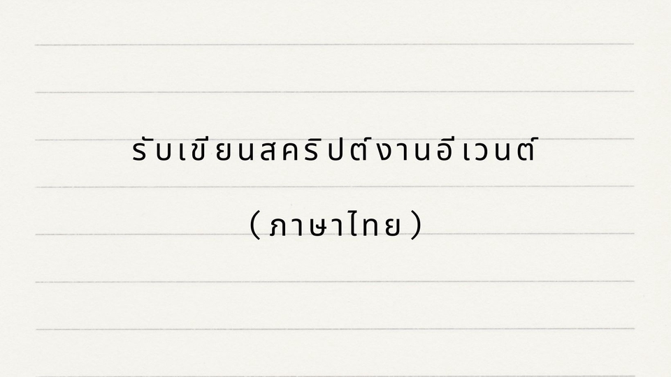รับเขียนสคริปต์งานอีเวนต์ทุกรูปแบบเป็นภาษาไทย สคริปต์ MC พิธีกร โดยลูกค้ามี Agenda หรือ Sequence คิวงานมาแล้ว บรีฟ Mood&Tone หรือคาแร็คเตอร์ MC ที่ต้องการ ขั้นตอนการทำงาน 1. รับบรีฟงาน : Agenda/Sequence, ข้อมูลจำเป็น 2. ส่งใบเสนอราคา 3. ส่งงานตรวจครั้งที่ 1 / แก้ไขงาน 4. ส่งงานตรวจครั้งที่ 2 / แก้ไขงาน 5. ส่งงาน Final ไฟล์ word หรือ PDF แล้วแต่ลูกค้าระบุ