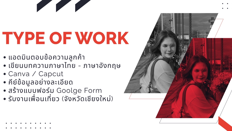 - สามารถรับงานได้หลากหลายรูปแบบ - เพื่อนเที่ยว (จังหวัดเชียงใหม่) - เขียนบทความภาษาไทย - อังกฤษ - Canva / Capcut