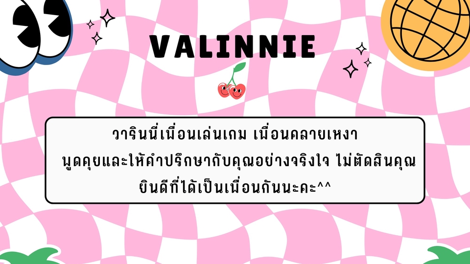 ใครหาเพื่อนคุยแก้เหงาหรือต้องการคนที่ให้คำปรึกษาอย่างจริงใจ วารินนี่จะเป็นเพื่อนคุยเพื่อนเล่นให้คุณเองค่ะ ไม่ว่าจะเรื่องไหนเราจะรับฟังคุณโดยไม่ตัดสิน อยากให้คุณเอนจอยกับการเล่นเกม การได้พูดคุยกับใครสักคน หลังจากที่เหนื่อยหรือผ่านเรื่องราวต่าง ๆ ในชีวิต หากรู้สึกเหงาเคว้งคว้าง โดนเดี่ยว ขอให้คุณรู้ไว้ว่ายังมีวารินนี่คนนี้พร้อมเอนจอยกับคุณและรับฟังอยู่เสมอนะคะ เรื่องราวต่าง ๆ ที่คุณและวารินนี่ได้สนทนากันจะเป็นความลับของเราแน่นอนค่ะ ขั้นตอนการทำงาน 1. พูดคุยทำความรู้จัก 2. ตกลงเวลาและราคา สามารถพูดคุยเพิ่มเติมหรือรีเควสเรื่องใดเป็นพิเศษได้ 3. เริ่มเล่นเกม ทั้งนี้สามารถข้ามขั้นตอนที่ 1 และ 2 เพื่อเล่นเกมพูดคุยกันได้ทันทีตามที่คุณต้องการ