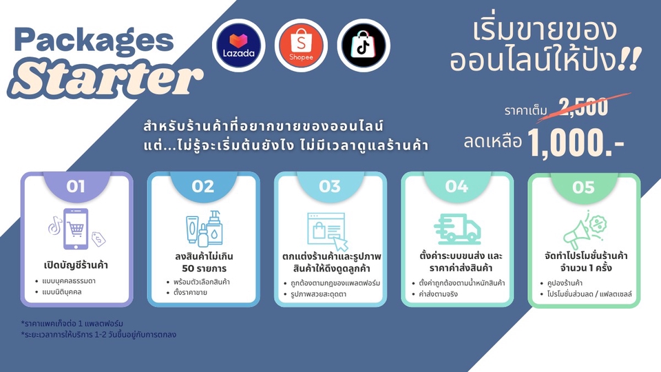 ฿1,000แพจเกจสำหรับลูกค้าที่อยากเปิดร้านค้าออนไลน์ แต่ไม่รู้จะเริ่มต้นยังไง หรือไม่มีเวลาดูแลร้านค้าออนไลน์ บริการของเราจะช่วยให้ลูกค้าสามารถเปิดขายออนไลน์ได้ภายใน 1-2 วัน 1. เปิดบัญชีร้านค้า 2. ลงสินค้าไม่เกิน 50 รายการ หรือโคลนนิ่งสินค้าจากแฟลตฟอร์มอื่น 3. ตกแต่งร้านค้า และรูปภาพสินค้าให้ดึงดูดลูกค้า 4. ตั้งค่าระบบขนส่ง และราคาค่าส่งสินค้า 5. จัดทำโปรโมชั่นร้านค้า 1 ครั้ง