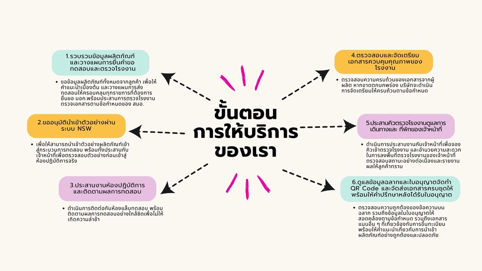 เรามีประสบการณ์ในการให้คำปรึกษาและดำเนินการขอใบอนุญาตจากหน่วยงานราชการ เพื่อให้ผลิตภัณฑ์สามารถจำหน่ายได้อย่างถูกต้องตามกฎหมาย ทั้ง การขึ้นทะเบียน อย. และการขึ้นทะเบียน มอก. เราสามารถดูแลให้ครบทุกขั้นตอน ตั้งแต่การตรวจสอบเอกสาร ประสานงานกับโรงงาน รวบรวมข้อมูล ไปจนถึงยื่นคำขอและติดตามผลอย่างใกล้ชิด เพื่อให้คุณมั่นใจว่าสินค้าถูกต้องตามกฎหมายและพร้อมวางจำหน่ายอย่างมืออาชีพ