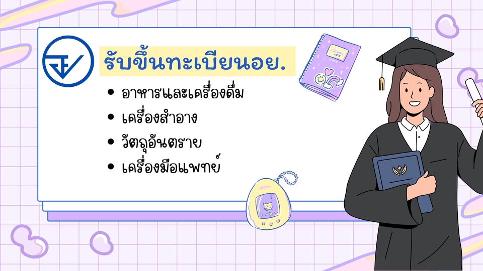 ฿3,000เราคือผู้เชี่ยวชาญด้านการขึ้นทะเบียนผลิตภัณฑ์กับ อย. มีประสบการณ์ตรงในการดำเนินการขออนุญาต ไม่ว่าจะเป็นผลิตภัณฑ์ประเภท อาหาร, เครื่องสำอาง, วัตถุอันตราย, และ เครื่องมือแพทย์ ดูแลครบทุกขั้นตอน