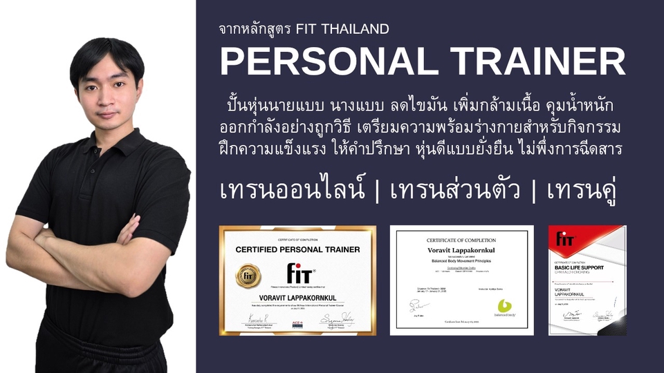 สอนออกกำลังกาย ให้คำปรึกษา 1. ลดไขมัน เพิ่มกล้ามเนื้อ 2. กระชับหุ่น กระชับสัดส่วน 3. ควบคุมน้ำหนัก 4. ปรับพฤติกรรม สร้างความมั่นใจในรูปร่าง เทรนทั้งออนไลน์, ออนไซต์, ส่วนตัว, เทรนคู่ สามารถสอนได้ทุกเพศ, ช่วงอายุ 8-60 ปี, ผู้มีโรคเรื้อรัง