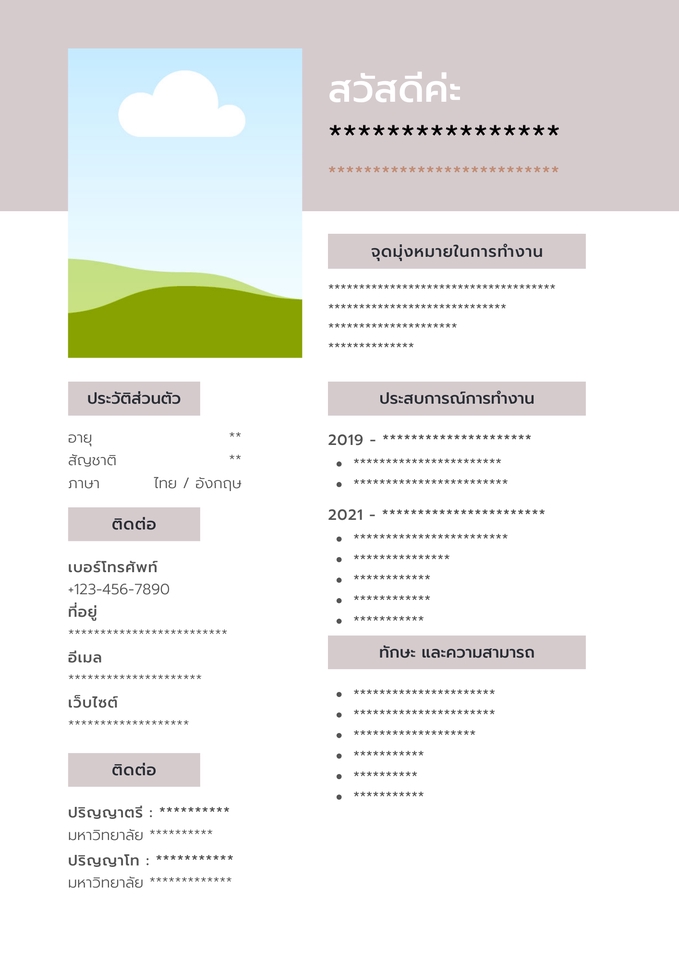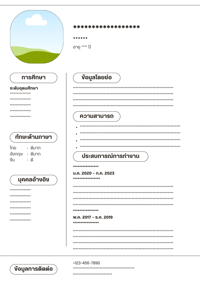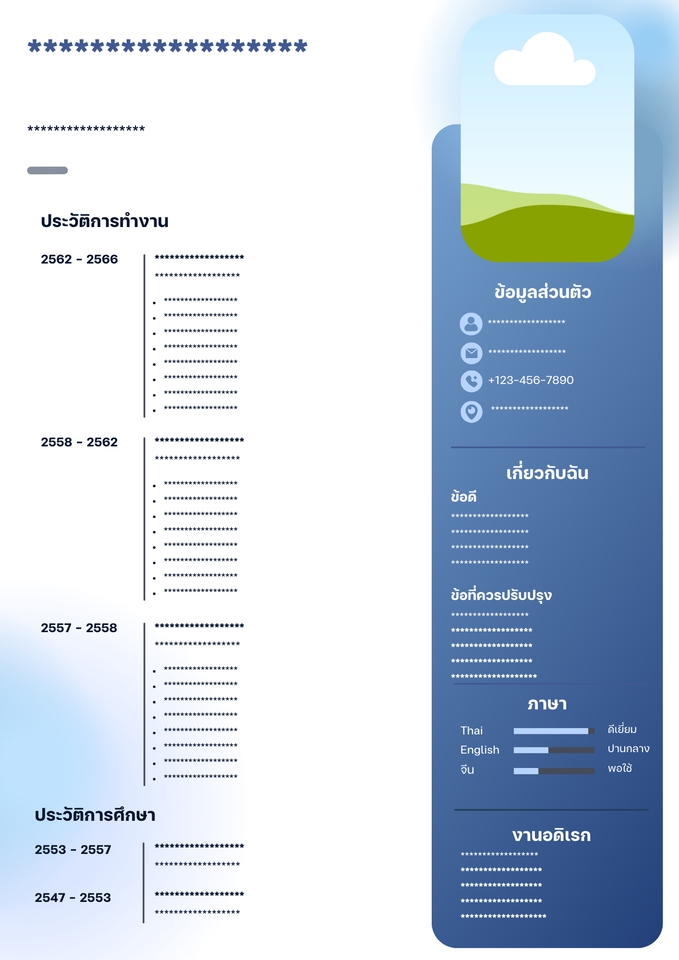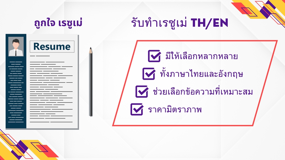 รับทำเรซูเม่ทั้งภาษาไทยและอังกฤษ มีแบบมห้เลือกหลากหลายทั้งทางการและไม่ทางการ ช่วยเลือกความเหมาะสมในการใช้ข้อมูล รูปภาพ ออกแบบและปรับแก้ให้ทันสมัย สมารถส่งไฟลมาหรือพูดคุยก็ได้หากยังไม่แน่ใจว่าต้องใส่อะไรบ้างทางเราจะเป็นผู้แนะนำให้ครบถ้วน ขั้นตอนการทำงาน 1. สอบถามรายละเอียดข้อมูล 2. เลือกแบบฟอร์มที่ถูกใจ 3. จัดแต่งลงแบบฟอร์มให้เหมาะสม 4. ส่งตรวจความเรียบร้อยก่อนส่งงานสามารถปรับแก้ได้