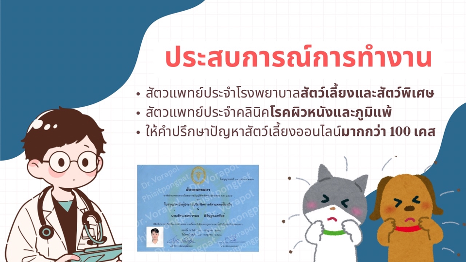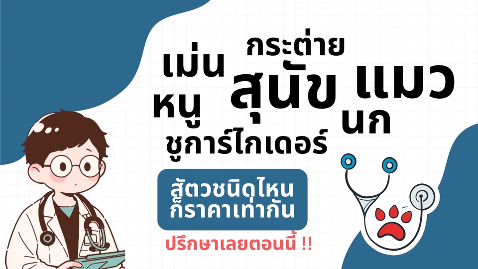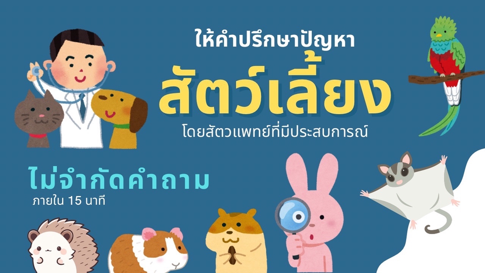 “พาไปหาหมอเลยดีไหมน้า?” “ตอนนี้คลินิคปิดหมดเลย จะรักษาเบื้องต้นยังไงดี?” “อาการนี้ถ้าพาไปรักษาจะมีค่าใช้จ่ายประมาณเท่าไหร่” ให้ผมได้ช่วยคลายความกังวล ช่วยแนะนำแนวทางการรักษา หรือการดูแลเบื้องต้น ผ่านการปรึกษาโดยการคอลหรือวีดีโอคอล 15 นาที ไม่ว่าจะเป็นสปีชีส์อะไรก็ราคาเดียว ~~~~ 📌 บริการให้คำปรึกษาสัตวแพทย์ โดยสัตวแพทย์มีประสบการณ์ เข้าใจทุกความกังวล ไม่ตัดสิน ให้ข้อมูลตามวิชาการและประสบการณ์ ~~~~ 📱 ช่องทางให้บริการ ให้บริการผ่านการคอล หรือ วีดีโอคอล ผ่าน Google meet , Zoom โดยนัดหมายล่วงหน้า ผ่านแชท Fastwork ~~~~ 🎓ประวัติผู้ให้คำปรึกษา -สัตวแพทยศาสตร์บัณฑิต มหาวิทยาลัยมหิดล -Certificate of achievement : Small animal dermatology for beginners and beyond -Certificate of attendance , Dermatology 3 of the European school for Advanced veterinary Studies (ESAVS) -สัตวแพทย์ประจำโรงพยาบาลสัตว์เลี้ยงและสัตว์เลี้ยงพิเศษ -สัตวแพทย์ประจำคลินิคโรคผิวหนังและภูมิแพ้ -ให้คำปรึกษาปัญหาสัตว์เลี้ยงออนไลน์มาแล้วมากกว่า 100 เคส ~~~~ 📌ข้อตกลง 1) บริการนี้เป็นเพียงการให้คำปรึกษา ไม่สามารถทดแทนการตรวจร่างกายและการตรวจอื่นๆได้ 2) การปรึกษานี้ไม่สามารถยืนยันการวินิจฉัยโรคได้ 3) หากสัตว์เลี้ยงอาการเข้าข่ายอาการดังนี้ - หอบอ้าปากหายใจ-หยุดหายใจ - ชักเกร็ง - หมดสติ - ปัสสาวะไม่ออก - กินสิ่งมีพิษ เช่น ยาฆ่าแมลง - อุบัติเหตุฉุกเฉิน เช่น รถชน ตกตึก 👉🏻 เหล่านี้คืออาการฉุกเฉินให้นำส่งโรงพยาบาลสัตว์ทันทีครับ ไม่มีวิธีรักษาเบื้องต้น