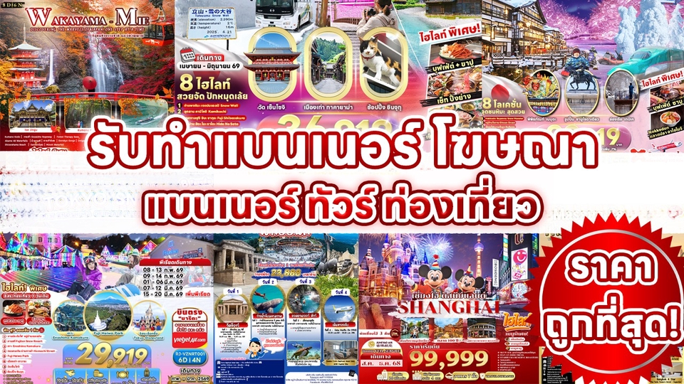 ออกแบบแบนเนอร์ โปรแกรมทัวร์ ท่องเที่ยว ออกแบบแบนเนอร์ โฆษณา สินค้า แบนเนอร์ป้ายไวนิล สำหรับแบนเนอร์โปรแกรม ทัวร์ท่องเที่ยว ทั้งใน และนอกประเทศ นำสถานที่ เที่ยว ต่างๆ มารวมกันอยู่ในแบบเนอร์เดียว ตาม ผลงานที่ได้ลงไว้ ครับ ขั้นตอนการทำงาน 1. ลูกค้า บรีฟงาน รายละเอียด สถานที่ ท่องเที่ยว ต้องการอะไรมาใส่ในแบนเนอร์บ้าง และสี กับโทนสี 2. ออกแบบ 3. ส่งงาน 4. แก้งาน