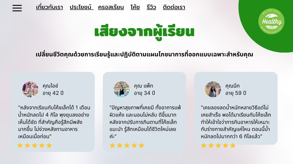 โค้ชเล็กจาก Vreasyhealthy ผู้เชี่ยวชาญด้านโภชนาการและสุขภาพแบบองค์รวม ช่วยวิเคราะห์องค์ประกอบร่างกาย ออกแบบแผนการกินเฉพาะบุคคล ดูแลสุขภาพให้ยั่งยืน ไม่ใช่แค่ลดน้ำหนัก แต่ฟื้นฟูจากภายใน เหมาะกับทุกไลฟ์สไตล์