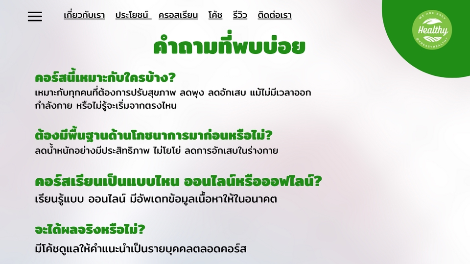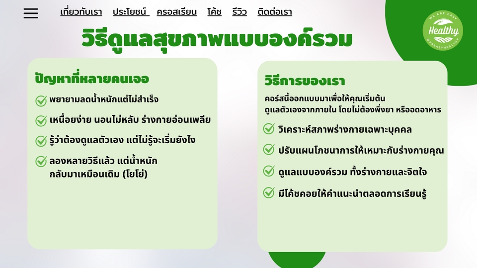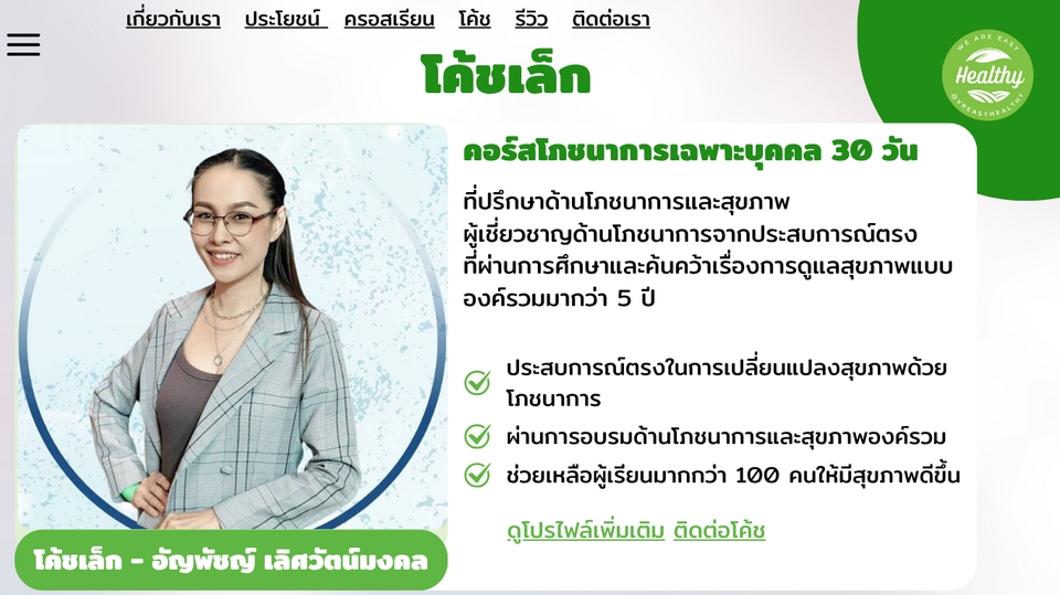 🥗 คอร์สดูแลสุขภาพส่วนบุคคล 30 วัน – ลดพุง ลดอักเสบ ไม่โยโย่ โดยไม่มียา! เรียนรู้ “โภชนาการเฉพาะบุคคล” กับโค้ชมืออาชีพ ประสบการณ์ตรงด้านสุขภาพและโภชนาการแบบองค์รวม --- 🔍 รายละเอียดบริการ ✅ วิเคราะห์สุขภาพเฉพาะบุคคล ✅ ปรับแผนโภชนาการให้เหมาะกับร่างกายคุณ ✅ มีโค้ชดูแลแบบตัวต่อตัวตลอด 30 วัน ✅ ไม่ต้องใช้ยา ไม่ต้องอดอาหาร ✅ เรียนรู้ผ่านออนไลน์ มีอัปเดตเนื้อหาให้ต่อเนื่อง ✅ เข้าใจร่างกายของตัวเอง พร้อมเทคนิคการกินที่ยั่งยืน --- 📚 สิ่งที่จะได้รับ แผนโภชนาการเฉพาะบุคคล 30 วัน คลาสเรียนออนไลน์เข้าใจง่าย เอกสารและคู่มือประกอบการเรียน ให้คำปรึกษา 1:1 กับโค้ชเล็ก ตลอดคอร์ส ความรู้ในการอ่านค่าผลสุขภาพพื้นฐาน --- 🎯 เหมาะกับใคร? คนที่ลดน้ำหนักไม่สำเร็จ ไม่เคยเห็นผล ไม่มีเวลาออกกำลังกาย แต่ใส่ใจสุขภาพ อยากลดพุง ลดอักเสบ แบบยั่งยืน เคยโยโย่จากการอดอาหาร/ดีท็อกซ์ ไม่รู้จะเริ่มดูแลตัวเองยังไง --- 👩⚕️ เกี่ยวกับโค้ชเล็ก โค้ชเล็ก – อัญพัชญ์ เลิศวัฒน์มงคล ที่ปรึกษาด้านโภชนาการและสุขภาพประสบการณ์ตรงกว่า 9 ปี ดูแลสุขภาพมาแล้วมากกว่า 100 คน