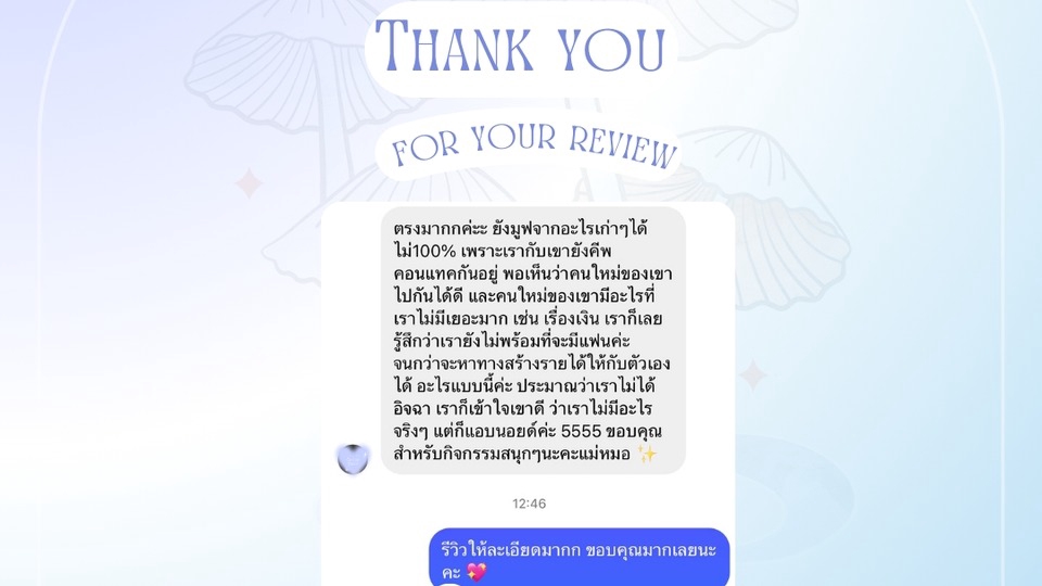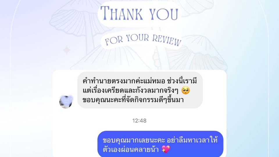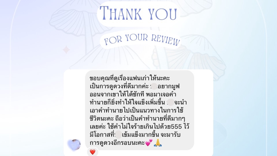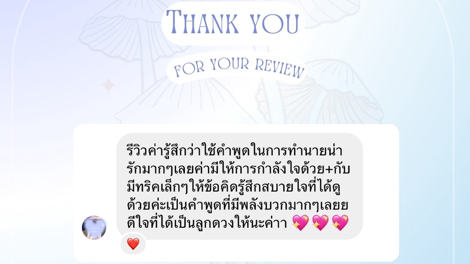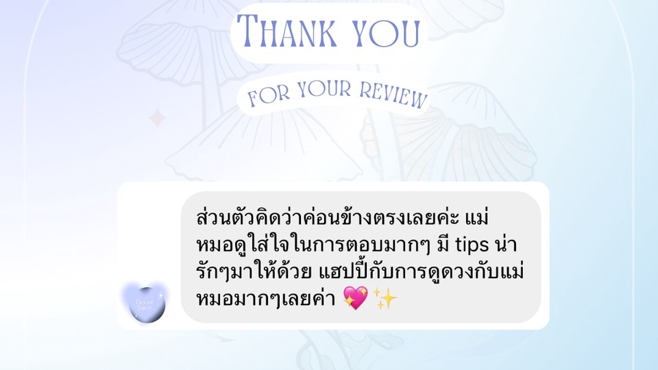 ฿199หลังจากตกลงชำระค่าครูผ่าน Fastwork และทำการนัดวัน-เวลาที่ต้องการดูดวงเรียบร้อย จะมีการส่ง Contact สำหรับ Add Line เพื่อเริ่มทำการดูดวง ลูกดวงสามารถถามคำถามที่ต้องการดูดวงได้ทั้งหมด 5 คำถาม โดยสามารถถามทีเดียว 5 คำถาม เพื่อให้แม่หมอตอบกลับ หรือถามทีละคำถาม เมื่อแม่หมอตอบกลับเรียบร้อยแล้วค่อยถามคำถามต่อไปก็ได้ค่ะ