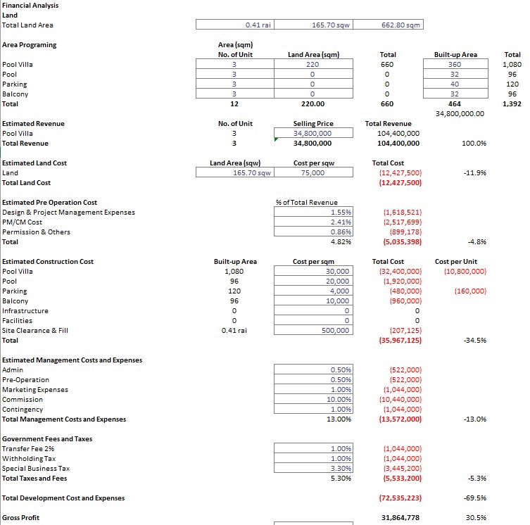 ให้คำปรึกษา และทำ financial model อสังหาริมทรัพย์ ในการพัฒนาโดรงการต่างๆ ตามที่ลูกค้าต้องการ เพื่อให้เหมาะสมกับธุรกิจนั้นๆ Analyse and create the feasibility study for the property development. ขั้นตอนการทำงาน 1. สอบถามรายละเอียดเกี่ยวกับการบริการที่ลูกค้าต้องการ 2. แนะนำเบื้องต้นเพื่อให้ตรงตามจุดประสงค์ของลูกค้า 3. จัดทำ financial model ตามความต้องการลูกค้า