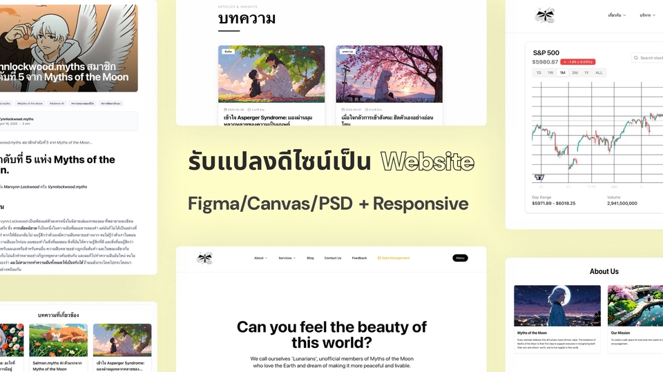 รายละเอียดงาน รับแปลงดีไซน์เป็นเว็บไซต์: แปลง Figma, PSD หรือ Canvas เป็นเว็บไซต์ HTML/CSS/JS ที่ตรงกับต้นฉบับ Responsive Design: รองรับการแสดงผลทุกหน้าจอ ทั้งคอมพิวเตอร์ แท็บเล็ต และมือถือ พัฒนา Frontend ด้วยเทคโนโลยีสมัยใหม่: ใช้ React.js, Next.js หรือ Vanilla JS พร้อมรองรับ Tailwind CSS, MUI, Ant Design, Shadcn UI หรืออื่น ๆ ตามที่ลูกค้าต้องการ ประสบการณ์และความเชี่ยวชาญ - มีประสบการณ์ทำเว็บไซต์แบบ Full Stack - เชี่ยวชาญ HTML, CSS, JavaScript, React, Next.js - ถนัดใช้ Frontend Framework และ UI Library หลากหลาย เช่น Tailwind CSS, MUI, Ant Design, Shadcn UI - เข้าใจหลัก UX/UI และเขียนโค้ดที่สะอาด ปรับแต่งง่าย และดูแลรักษาได้ง่ายในระยะยาว ขั้นตอนการทำงาน 1. พูดคุยเพื่อเข้าใจความต้องการ และรับชมไฟล์ดีไซน์ 2. ประเมินระยะเวลาและเสนอราคาที่เหมาะสม 3. เริ่มพัฒนาโดยอัปเดตความคืบหน้าให้ทราบเป็นระยะ 4. ทดสอบเว็บไซต์บนหลายอุปกรณ์และหลายเบราว์เซอร์ 5. ส่งมอบงานพร้อมไฟล์ทั้งหมด และคู่มือแนะนำเบื้องต้น สิ่งที่ต้องการจากผู้ว่าจ้าง - ไฟล์ดีไซน์ (Figma, PSD, Canvas หรืออื่น ๆ) - ฟอนต์และภาพประกอบที่ใช้ในดีไซน์ (ถ้ามี) - เนื้อหาและข้อความที่ต้องการใช้ในหน้าเว็บไซต์ - รายละเอียดฟีเจอร์เพิ่มเติม (เช่น เมนู, ฟอร์ม, ปุ่ม, ฯลฯ) - หากมี Framework หรือ Library ที่ต้องการระบุ สามารถแจ้งได้เลยครับ ข้อกำหนดและเงื่อนไข - ไม่รับงานที่เกี่ยวข้องกับการพนัน, สิ่งผิดกฎหมาย หรือละเมิดลิขสิทธิ์ - ระยะเวลาและค่าบริการขึ้นอยู่กับความซับซ้อนของงานและจำนวนหน้า ตัวอย่างผลงาน ผมมีเว็บไซต์ที่เป็นโปรเจกต์ส่วนตัว สามารถเข้าดูเพื่อประกอบการตัดสินใจได้ครับ 🌐 Website: [https://lunarian-myths.com](https://lunarian-myths.com)