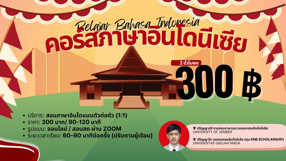เปิดคอร์ส ภาษาอินโดนีเซีย 1:1 เรียนออนไลน์ สดผ่าน Zoom ปรับเนื้อหาตามเป้าหมายผู้เรียน 🕒 2 ชั่วโมง เพียง 300 บาท เหมาะสำหรับ ✔️ คนเริ่มต้น ✔️ คนทำงานกับอินโด ✔️ นักเรียนทุน / นักศึกษา ✔️ คนอยากสื่อสารได้จริง เรียนแบบไม่ท่องจำ เน้น “ใช้ได้” ไม่ใช่แค่ “รู้”