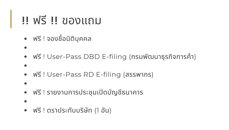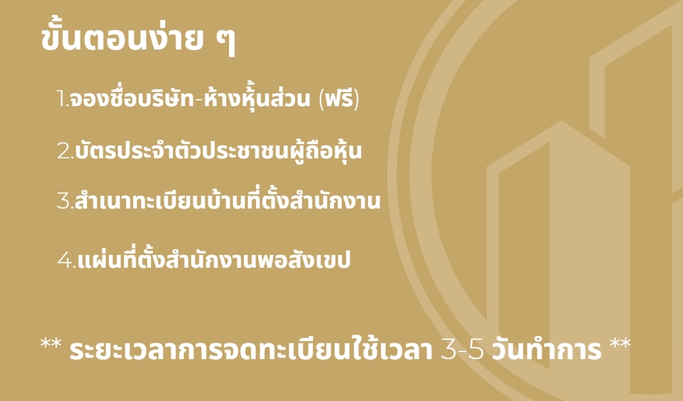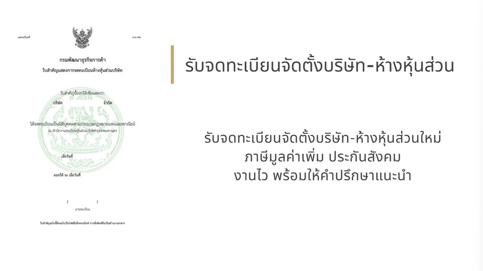 จดทะเบียนบริษัท จัดตั้งบริษัทใหม่ จดทะเบียนห้างหุ้นส่วน ทุนเริ่มต้นแค่ 10 บาท - บริการรวดเร็ว ด้วยระบบ DBD ออนไลน์ เสร็จสิ้น ภายใน 5 วันทำการหลังจากได้รับเอกสารครบถ้วน* - จดทะเบียนภาษีมูลค่าเพิ่ม * - ขึ้นทะเบียนนายจ้าง ประกันสังคม* - ส่งข้อมูลทาง Email หรือ ทาง Line เพื่อความสะดวก สบาย จดทะเบียนวันนี้ฟรี !! -จองชื่อนิติบุคคล -Username Password DBD E-Filing กรมพัฒนาธุรกิจการค้า และ RD E-filing สรรพากร -รายงานการประชุม เปิดบัญชีธนาคาร -ตราประทับนิติบุคคล 1 อัน -คำแนะนำเบื้องต้นเกี่ยวกับบริษัท —————————————————