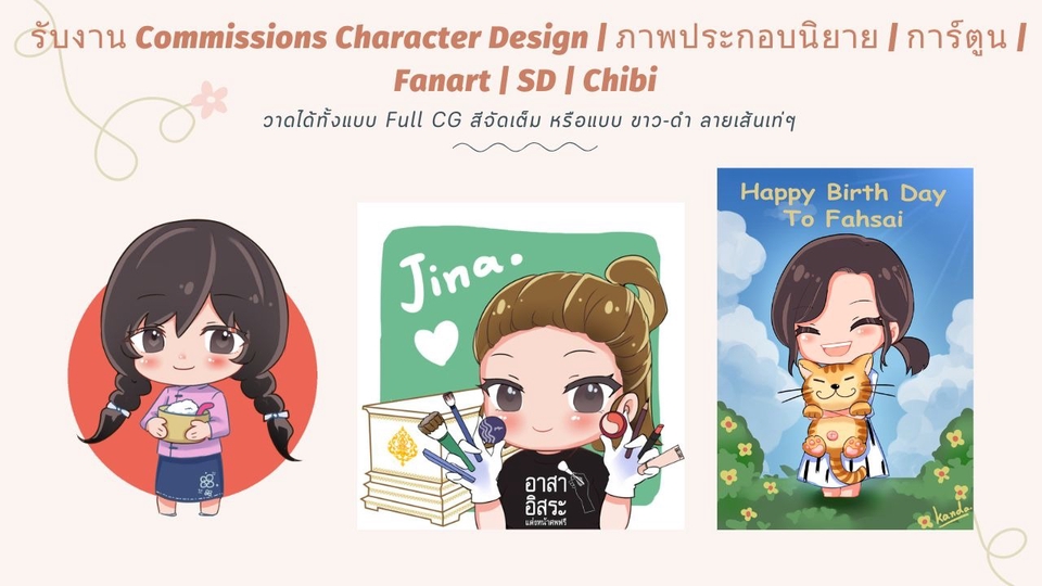 Character Design | ภาพประกอบนิยาย | การ์ตูน | Fanart | SD / Chibi วาดได้ทั้งแบบ Full CG สีจัดเต็ม หรือแบบ ขาว-ดำ ลายเส้นเท่ๆ ใช้โปรแกรม Clip Studio Paint ไฟล์ที่ได้รับ: PNG / JPG / PSD 💰 เรทราคา (ราคาเริ่มต้น อาจมีบวกเพิ่มตามความละเอียดงาน) ประเภทงาน และราคาเริ่มต้น Headshot (หัวถึงไหล่) 700฿+ Waist Up (ครึ่งตัวบน) 850฿+ Half Body (ครึ่งตัว) 1,000฿+ Full Body (เต็มตัว) 2,000฿+ เพิ่มฉากหลัง (Background) 500฿+ ⚠️ ราคานี้ยังไม่รวมการใช้งานเชิงพาณิชย์ หากต้องการนำไปใช้เชิงพาณิชย์ คิดราคา x2 ค่ะ ขั้นตอนการทำงาน 1. คุยรายละเอียดงาน: แจ้งว่าอยากได้ภาพแนวไหน ใช้ไปทำอะไร (ส่วนตัว / เชิงพาณิชย์) 2. แจ้งรายละเอียดให้ครบถ้วน เช่น ตัวละครเพศไหน หน้าตา ทรงผม สีผิว ชุด ท่าโพส อารมณ์ ฉากหลัง ฯลฯ 3. เริ่มวาด! 3.1 สเกตแบบร่าง ส่งให้ดู 3.2 ลงเส้น+สีเบื้องต้น ส่งให้เช็ก 3.3 เก็บรายละเอียด ส่งให้ตรวจงานรอบสุดท้ายก่อนส่งไฟล์จริง 4. แก้งานได้ 3 ครั้งฟรี!: ถ้าเกิน 3 ครั้ง อาจมีค่าบริการเพิ่มเติมตามความเหมาะสม 5. ส่งไฟล์ต้นฉบับตามที่ลูกค้าต้องการ (PNG, JPG, PSD แล้วแต่เลือก) รับวาดแนว: การ์ตูน SD / จิบิ ตัวละคร OC Fanart อนิเมะ ภาพประกอบนิยาย / ฉากโมเมนต์ / สติ๊กเกอร์ Line และอื่นๆ สอบถามได้เลยค่า! 📩 สนใจจ้างงานหรือสอบถามเพิ่มเติม ทักมาได้เลย ยินดีให้บริการค่ะ~ 💕✨ (ตอบไว ใจดี ไม่ดุ นะคะ) 🐣 ขั้นตอนการทำงาน 1. คุยรายละเอียดงาน: แจ้งว่าอยากได้ภาพแนวไหน ใช้ไปทำอะไร (ส่วนตัว / เชิงพาณิชย์) 2. แจ้งรายละเอียดให้ครบถ้วน เช่น ตัวละครเพศไหน หน้าตา ทรงผม สีผิว ชุด ท่าโพส อารมณ์ ฉากหลัง ฯลฯ 3. สเกตแบบร่าง ส่งให้ดู 4. ลงเส้น+สีเบื้องต้น ส่งให้เช็ก 5. เก็บรายละเอียด ส่งให้ตรวจงานรอบสุดท้ายก่อนส่งไฟล์จริง 6. แก้งานได้ 3 ครั้งฟรี! ถ้าเกิน 3 ครั้ง อาจมีค่าบริการเพิ่มเติมตามความเหมาะสม 7. ส่งไฟล์ต้นฉบับตามที่ลูกค้าต้องการ (PNG, JPG, PSD แล้วแต่เลือก)