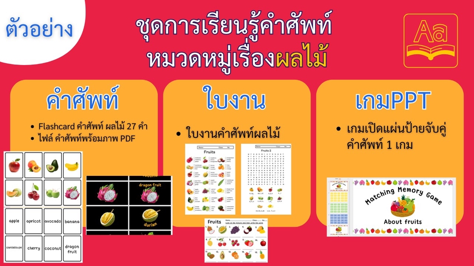 ตัวอย่างชุดการเรียนรู้คำศัพท์หมวดผลไม้ สำหรับใช้สอนภาษาอังกฤษ