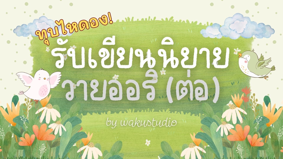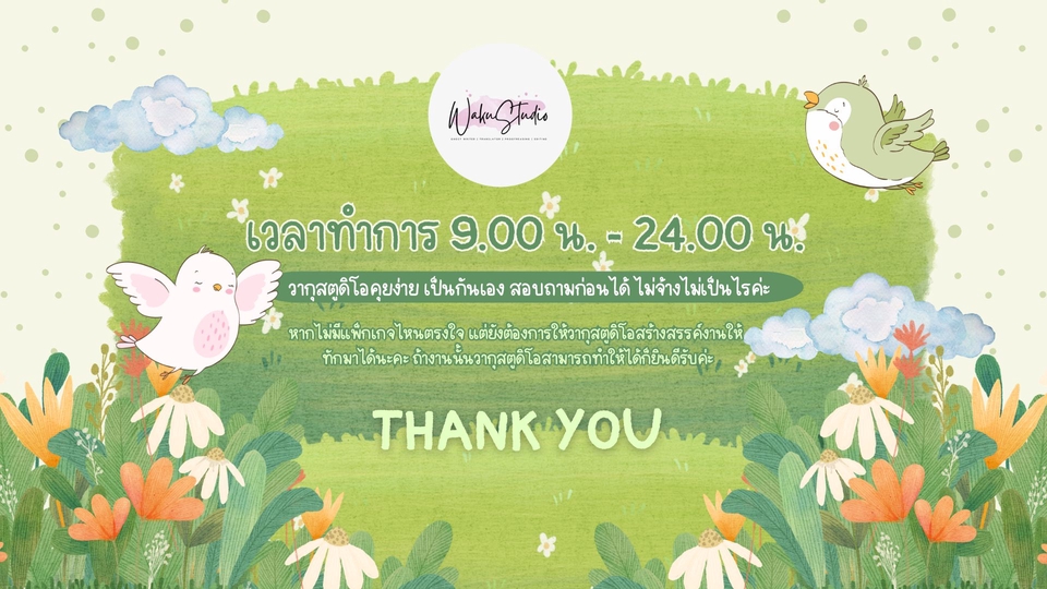 สวัสดีค่ะ วากุสตูดิโอยินดีให้บริการงานเขียน (ประสบการณ์มากกว่า 20 ปี) งานแปล (ประสบการณ์ ราว 5 ปี) และพิสูจน์อักษร (ตลอดการทำงาน) หากสนใจ ทักแชทมาสอบถามได้นะคะ เวลาทำการ 9.00 น. ถึง 24.00 น. ค่ะ