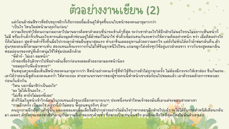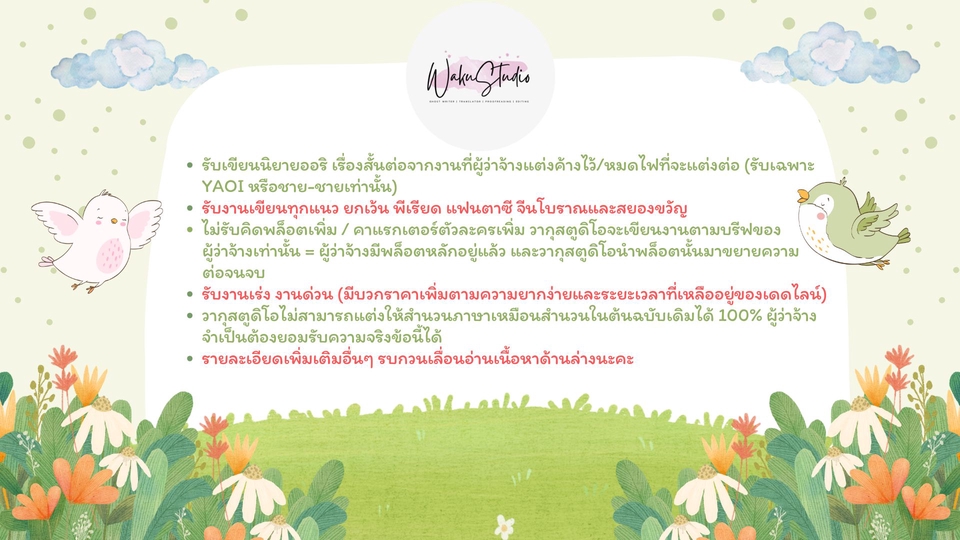 ★ รายละเอียดรับงานทุบไหดองในฐานะนักเขียนเงา ★ 1. รับเขียนนิยายออริ เรื่องสั้นต่อจากงานที่ผู้ว่าจ้างแต่งค้างไว้/หมดไฟที่จะแต่งต่อ (รับเฉพาะ YAOI หรือชาย-ชายเท่านั้น) 2. รับงานเขียนทุกแนว ยกเว้น พีเรียด แฟนตาซี จีนโบราณและสยองขวัญ 3. ไม่ค่อยถนัด Mpreg และ Omegaverse แต่ลองคุยรายละเอียดกันก่อนได้นะคะ 4. เขียน NC ได้ (กรุณาบรีฟว่าต้องการประมาณไหน ตัดเข้าโคมไฟ / ละมุน / เร่าร้อน / pwp) 5. ไม่รับคิดพล็อตเพิ่ม / คาแรกเตอร์ตัวละครเพิ่ม วากุสตูดิโอจะเขียนงานตามบรีฟของผู้ว่าจ้างเท่านั้น = ผู้ว่าจ้างมีพล็อตหลักอยู่แล้ว และวากุสตูดิโอนำพล็อตนั้นมาขยายความต่อจนจบ 6. รับงานเร่ง งานด่วน (มีบวกราคาเพิ่มตามความยากง่ายและระยะเวลาที่เหลืออยู่ของเดดไลน์) 7. ไม่รับแต่งร้อยกรองทุกชนิด 8. การนับจำนวนคำ ยึดการนับในโปรแกรม word เป็นหลัก 9. วากุสตูดิโอไม่สามารถแต่งให้สำนวนภาษาเหมือนสำนวนในต้นฉบับเดิมได้ 100% ผู้ว่าจ้างจำเป็นต้องยอมรับความจริงข้อนี้ได้ 10. สามารถใช้ผลงานที่จ้างวากุสตูดิโอแต่งในเชิงพาณิชย์ได้ทุกกรณี (รวมเล่ม / e-book / ติดเหรียญ / โดเนท) โดยไม่มีบวกเพิ่ม 11. หากผู้ว่าจ้างต้องการดูตัวอย่างงานเขียนมากขึ้น สามารถทักมาขอตัวอย่างได้นะคะ ★ ขั้นตอนการทำงานของวากุสตูดิโอ ★ 1. ผู้ว่าจ้างทักแชทมาคุยรายละเอียดของงานที่ต้องการ โดยต้องมีพล็อตหลักและเนื้อหาเดิมที่เขียนค้างไว้ด้วย วากุสตูดิโอจะอ่านทำความเข้าใจเนื้อหาเดิม เพื่อให้งานเขียนดำเนินไปอย่างต่อเนื่องที่สุด 2. วากุสตูดิโอประเมินราคาและระยะเวลาในการทำงานให้ผู้ว่าจ้างทราบ ผู้ว่าจ้างสามารถปฏิเสธการจ้างงานหรือตกลงจ้างงานได้ในขั้นตอนนี้ 3. วากุสตูดิโอออกใบเสนอราคาให้ผู้ว่าจ้าง 4. ผู้ว่าจ้างชำระเงินเต็มจำนวนหรือแบ่งชำระ (แพ็กเกจ 3 - 6) เข้าระบบ 5. วากุสตูดิโอเขียนงานตามบรีฟและระยะเวลาที่กำหนดไว้ โดยวากุสตูดิโอจะแจ้งความคืบหน้าของงานเขียนเมื่อถึง 50% และ 80% ของเรื่อง หรือผู้ว่าจ้างจะทักมาสอบถามด้วยตัวเองก็ได้ค่ะ 6. วากุสตูดิโอส่งงาน 100% ให้ผู้ว่าจ้างในรูปแบบ PDF มีลายน้ำ 7. ผู้ว่าจ้างตรวจสอบงานโดยสามารถแจ้งให้วากุสตูดิโอแก้ไขงานได้จำนวนครั้งตามแพ็กเกจ (ไม่กระทบต่อพล็อตของเรื่อง) หากเกินกว่านั้น คิดค่าบริการครั้งละ 50 บาท 8. วากุสตูดิโอส่งงานที่เสร็จสมบูรณ์แล้วในรูปแบบ PDF มีลายน้ำ เพื่อให้ผู้ว่าจ้างกดอนุมัติงาน 9. เมื่อผู้ว่าจ้างกดอนุมัติงานแล้ว วากุสตูดิโอจะส่งงานที่เสร็จสมบูรณ์แล้วในรูปแบบ .docx (Word) และ PDF แบบไม่มีลายน้ำให้ผู้ว่าจ้าง 10. เมื่อส่งงานให้ผู้ว่าจ้างและวากุสตูดิโอได้รับค่าจ้างครบแล้ว ลิขสิทธิ์