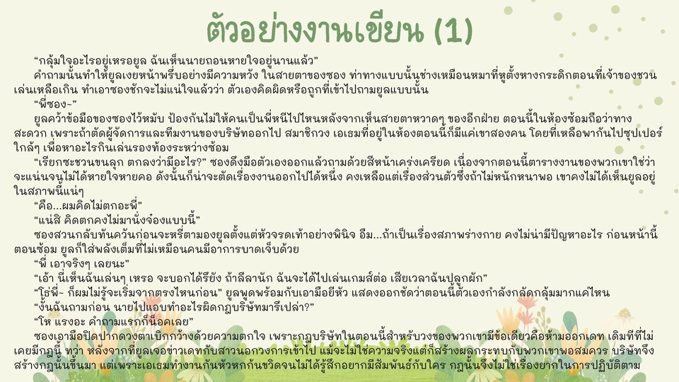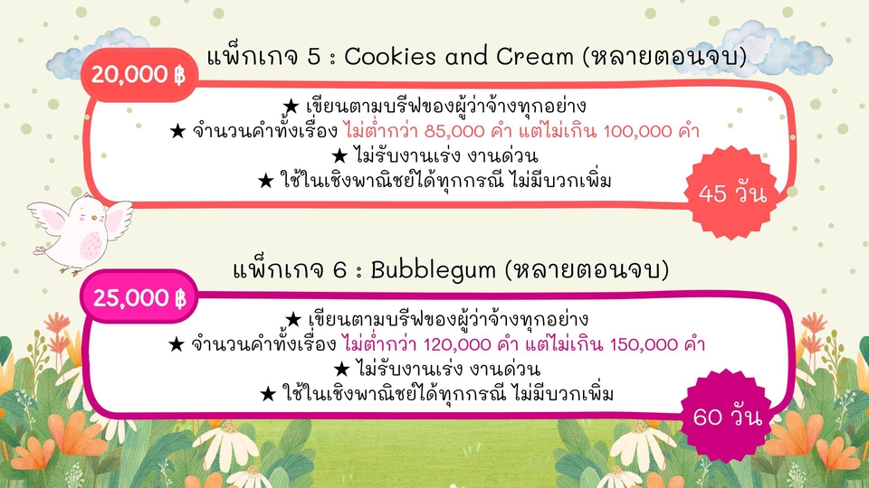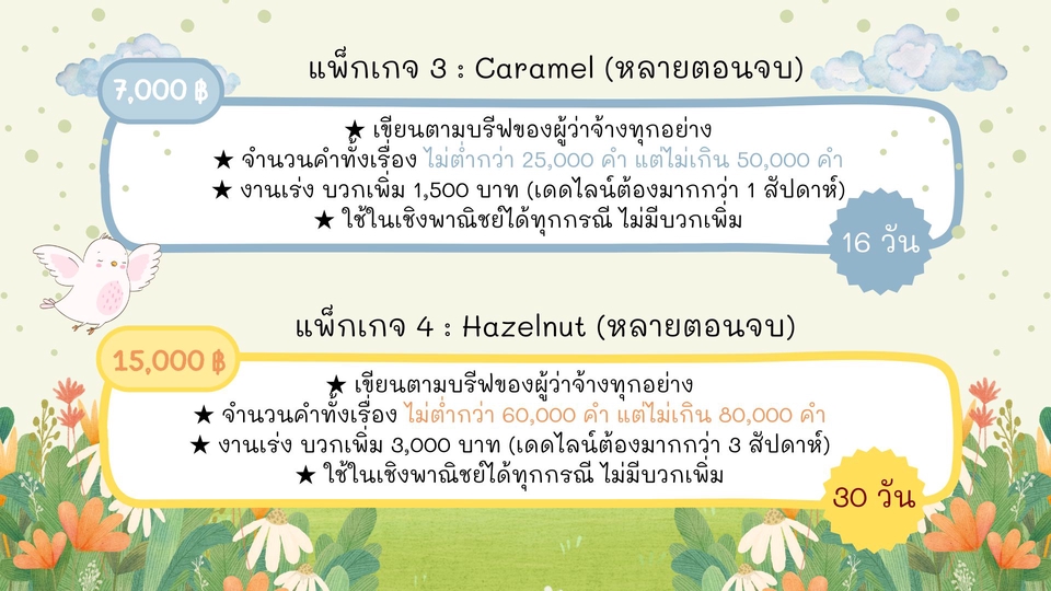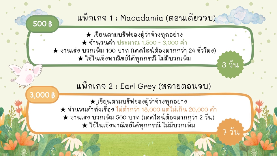 ฿7,000★ เขียนตามบรีฟของผู้ว่าจ้างทุกอย่าง ★ จำนวนคำทั้งเรื่อง ไม่ต่ำกว่า 25,000 คำ แต่ไม่เกิน 50,000 คำ ★ งานเร่ง บวกเพิ่ม 1,500 บาท (เดดไลน์ต้องมากกว่า 1 สัปดาห์) ★ ใช้ในเชิงพาณิชย์ได้ทุกกรณี ไม่มีบวกเพิ่ม