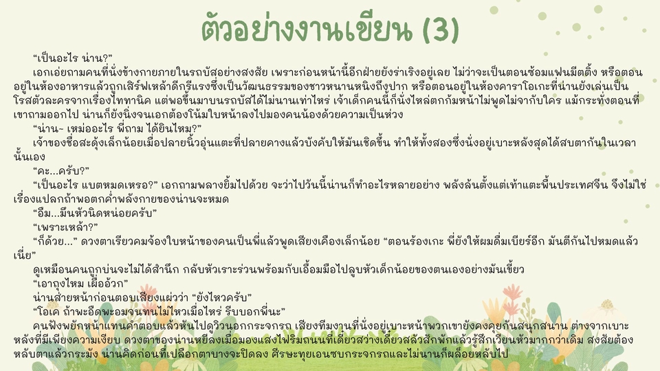 ฿15,000★ เขียนตามบรีฟของผู้ว่าจ้างทุกอย่าง ★ จำนวนคำทั้งเรื่อง ไม่ต่ำกว่า 60,000 คำ แต่ไม่เกิน 80,000 คำ ★ งานเร่ง บวกเพิ่ม 3,000 บาท (เดดไลน์ต้องมากกว่า 3 สัปดาห์) ★ ใช้ในเชิงพาณิชย์ได้ทุกกรณี ไม่มีบวกเพิ่ม