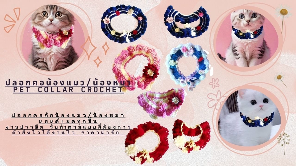 ✨ งานฝีมือแท้ 100% ถักไหมพรมเป็นปลอกคอสำหรับน้องหมาน้องแมว 🧶 ถักแน่น สวยงาม ลวดลายน่ารักไม่ซ้ำใคร 💐 มีให้เลือกหลายแบบ ทั้งลายดอกไม้ ลายโบว์ หรือลายแฟนซี หรือรับทำตามแบบที่ลูกค้าต้องการได้คะ 🐾 ใส่ได้จริง ไม่ระคายผิว ไม่รัดแน่น สวมใส่สบาย 🎁 เหมาะสำหรับเป็นของขวัญให้น้อง ๆ หรือใช้ถ่ายรูปน่ารัก ๆ ✅ สั่งทำตามรอบคอจริง ✅ เลือกสี / ลาย / ขนาดได้เอง ✅ รับออร์เดอร์จำนวนจำกัดต่อวัน เพื่อควบคุมคุณภาพ หากสนใจงานอื่นเช่นดอกไม้ถัก ตุ๊กตาถัก ที่รองจาน/แก้วน้ำ หมวก และอื่นๆสามารถสอบถามเพิ่มเติมได้คะ ✨ระยะเวลาจัดทำถึงวันได้รับของประมาณ 1 สัปดาห์ขึ้นอยู่กับแบบและปริมาณจำนวนที่สั่ง 📩 ก่อนกดสั่ง รบกวนทักมาสอบถาม / แจ้งรอบคอ และเลือกแบบก่อนนะคะ 🐾ราคาเริ่มตั้นที่ชิ้นละ 159-259 บาท ค่าจัดส่ง 30 บาท ช่วงราคาคิดตามขนาด 🧶ขนาดสัตว์เลี่ยง XS(ลูกแมว ชิวาว่า) รอบคอโดยประมาณ 18–22 cm ราคา 159 บาท 🧶ขนาดสัตว์เลี่ยง S(แมวโต / พุดเดิ้ล) รอบคอโดยประมาณ 23-28 cm ราคา 189 บาท 🧶ขนาดสัตว์เลี่ยง M-L(โกลเด้น / ลาบราดอร์) รอบคอโดยประมาณ 29–40 cm ราคา 229-259 บาท