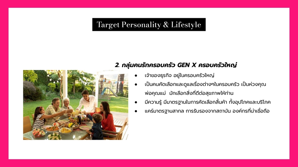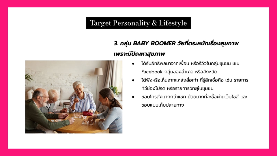 Re branding Package : Niche Navigator to Win ปักหมุดจุดชนะบนตลาดเฉพาะของคุณ >> เน้นปรับแบรนด์ ระบุ Niche Market ตลาดใหม่ที่จะเป็นเจ้าตลาดได้ แล้วเลือกลูกค้าที่ใช่ (Customer Soulmate) เหมาะสำหรับ : - เจ้าของแบรนด์ที่ขายได้ แต่มีแต่ลูกค้าขาจร ยังไม่เจอลูกค้าที่ใช่ อยากเพิ่มยอดให้โต แต่ไม่รู้จะโฟกัสจุดยืนไหนดี - เจ้าของแบรนด์ที่รู้สึกว่า อยากหาลูกค้าที่ใช่ (Soulmate Customer) ที่ชอบ รักในสินค้าที่เราส่งมอบ - เจ้าของแบรนด์ที่อยากปรับกลยุทธ จัดสินค้าเดิมให้ตรงใจลูกค้าที่ใช่ ตอบโจทย์โดนใจ จนลูกค้าลืมคู่แข่งแล้วนึกถึงแบรนด์เราเป็นแบรนด์แรก ขั้นตอนการทำงาน 1. ลูกค้าให้รายละเอียดเกี่ยวกับธุรกิจ พร้อม Business Objectives ที่โฟกัส 2. เสนอ Brand Direction #1 3. นัด VDO Call #1 เพื่อ Feedback 4. ส่ง Brand Direction หลังปรับพัฒนาแล้ว 5. ลูกค้าแจ้งปรับเพิ่ม (ถ้ามี) 6. ส่งมอบงาน Final