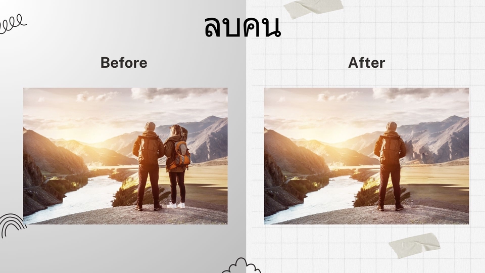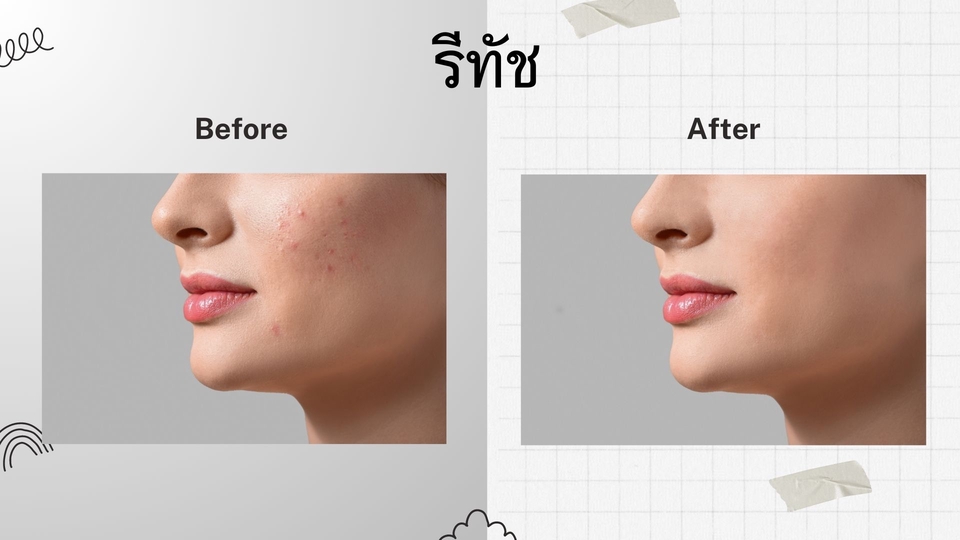 ไดคัท : ลบพื้นหลัง ทั้งแบบพื้นหลังโปร่งใสไฟล์ png. หรือพื้นหลังขาวไฟล์ jpg. รีทัช : ลบสิ่งที่ไม่ต้องการ ลบรอยสิว ตำหนิ หรือสิ่งของ ตัดต่อภาพ : ภาพติดบัตร, ภาพเครื่องแบบข้าราชการ และ uniform ต่างๆ แต่งภาพ : ทำผิวเรียบเนียน ปรับสี ปรับแสง ขั้นตอนการทำงาน 1. แจ้งรายละเอียด และส่งไฟล์ภาพเพื่อประเมินราคา 2. ส่งใบเสนอราคาให้ลูกค้า 3. ลูกค้าชำระเงิน 4. เริ่มทำงาน 5. ส่งตัวอย่าง เพื่อให้ลูกค้าตรวจสอบงาน 6. แก้ไขตามความพึงพอใจของลูกค้า 7. ส่งไฟล์งาน FINAL ให้ลูกค้าและจบงาน
