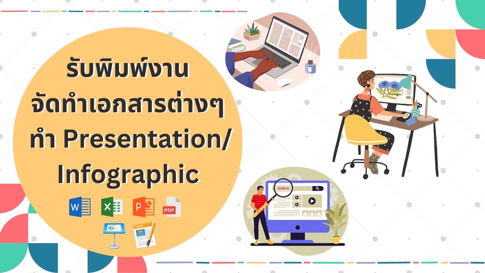รับพิมพ์งาน จากข้อมูลลายมือ หรือ ถอดเทป พร้อมจัดทำเอกสารต่างๆ จัดรูปเล่มรายงาน ค้นคว้าข้อมูล ทำ Presentation ทั้งภาษาไทย และภาษาอังกฤษ ในรูปแบบ Word, Excel, Powerpoint, Keynote, Page, Canva พร้อมแปลงเป็นไฟล์ PDF ขั้นตอนการทำงาน 1. ตกลงรายละเอียดของงาน เนื้อหา สิ่งที่อยากให้ทำ ธีมงาน 2. คอนเฟิร์มราคาและระยะเวลาในการทำงาน 3. กดสั่งซื้อ และส่งมอบข้อมูล 4. เริ่มทำงาน หากเป็น PPT จะมีการทำ Content Outlineให้ดูก่อนจัดหน้าให้สวยงาม 5. ส่งงาน พร้อมตรวจสอบความถูกต้อง พร้อมแก้ไขหากต้องการ 6. ส่งงานรอบสุดท้าย พร้อมคอนเฟิร์มจบงาน