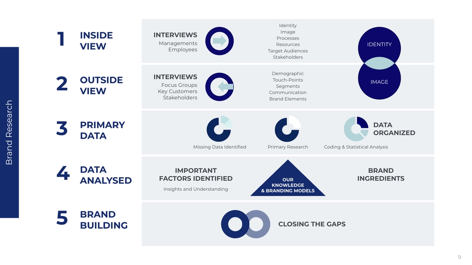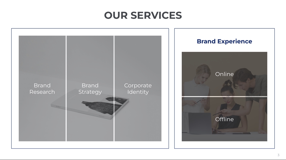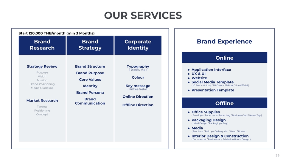 Brand Consultant ให้คำปรึกษาและออกแบบแบรนด์ 1.1 Brand Research วิจัยเพื่อสรัางแบรนด์ - Strategy Review วิเคราะห์การคงอยู่ของแบรนด์ - Market Research วิจัยการตลาดเบื้องต้น . 1.2 Brand Strategy กลยุทธ์การสร้างแบรนด์ - วางแผนระยะยาว เพื่อบรรลุวัตถุประสงค์ของธุรกิจ - Brand Structure / Brand Purpose / Core Values / Identity Brand Persona / Brand Communication . 1.3 Corporate Identity ออกแบบอัตลักษณ์ - วางแผนระยะยาว เพื่อบรรลุวัตถุประสงค์ของธุรกิจ - Brand Structure / Typography / Colour / Key Message / Offline Direction / Online Direction . 1.4 จัดทำรูปเล่มพร้อมนำเสนอ ขั้นตอนการทำงาน 1. Brand Research วิจัยเพื่อสรัางแบรนด์ 2. Strategy Review วิเคราะห์การคงอยู่ของแบรนด์ 3. Brand Strategy กลยุทธ์การสร้างแบรนด์ - วางแผนระยะยาว เพื่อบรรลุวัตถุประสงค์ของธุรกิจ เช่น Brand Structure / Brand Purpose / Core Values / Identity Brand Persona / Brand Communication 4. Corporate Identity ออกแบบอัตลักษณ์ - วางแผนระยะยาว เพื่อบรรลุวัตถุประสงค์ของธุรกิจ - Brand Structure / Typography / Colour / Key Message / Offline Direction / Online Direction 5. จัดทำรูปเล่มพร้อมนำเสนอ