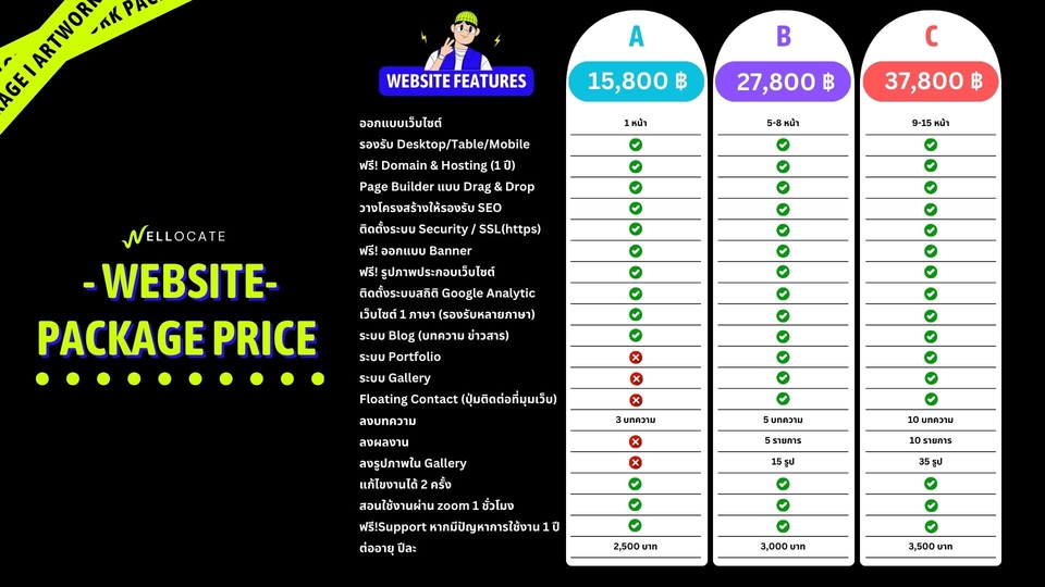 ฿27,800✔️ออกแบบ ✔️รองรับDesktop/Table/Mobile ✔️ฟรี!Domain & Hosting(1ปี) ✔️Page Builder แบบ Drag&Drop ✔️วางโครงสร้างให้รองรับSEO ✔️ติดตั้งระบบ Security/SSL(https) ✔️ฟรี!ออกแบบBanner/รูปภาพประกอบ ✔️ติดตั้งระบบสถิติGoogle Analytic ✔️เว็บไซต์ 1ภาษา(รองรับหลายภาษา) ✔️ระบบBlog(บทความ) ✔️ระบบPortfolio ✔️ระบบGallery ✔️Floating Contact(ปุ่มติดต่อที่มุมเว็บ) ✔️ลงบทความ 5บทความ ✔️ลงผลงาน 5รายการ ✔️ลงรูปภาพในGallery 15รูป ✔️แก้ไขงานได้ 2ครั้ง ✔️สอนใช้งานผ่านzoom 1ชั่วโมง ✔️ฟรี!Support หากมีปัญหาการใช้งาน 1ปี