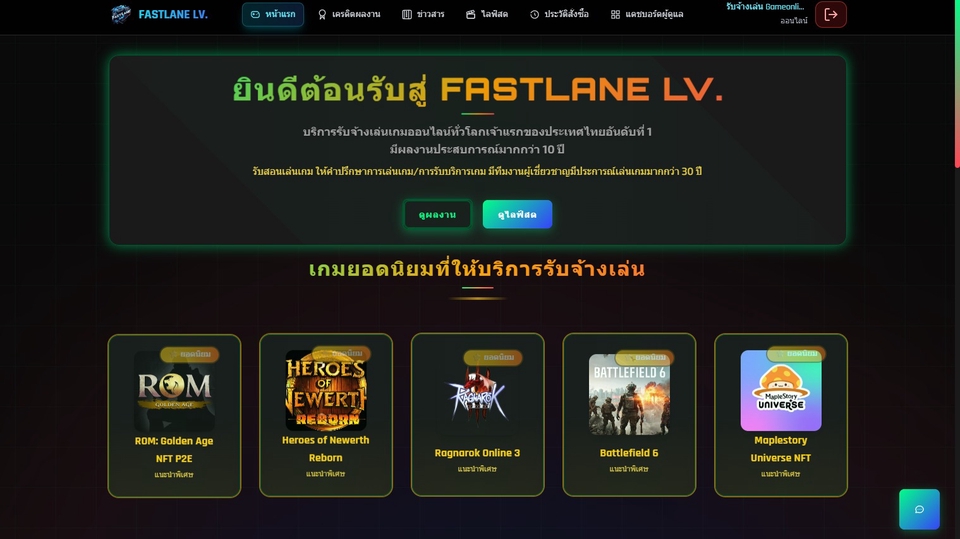 บริการรับจ้างเล่นเกมออนไลน์ทั่วโลกเจ้าแรกของประเทศไทยอันดับที่ 1 มีผลงานประสบการณ์มากกว่า 10 ปี รับสอนเล่นเกม ให้คำปรึกษาการเล่นเกม/การรับบริการเกม มีทีมงานผู้เชี่ยวชาญมีประการณ์เล่นเกมมากกว่า 30 ปี ออกรายการ TV ช่อง ThaiPBS สามัญชนคนไทย