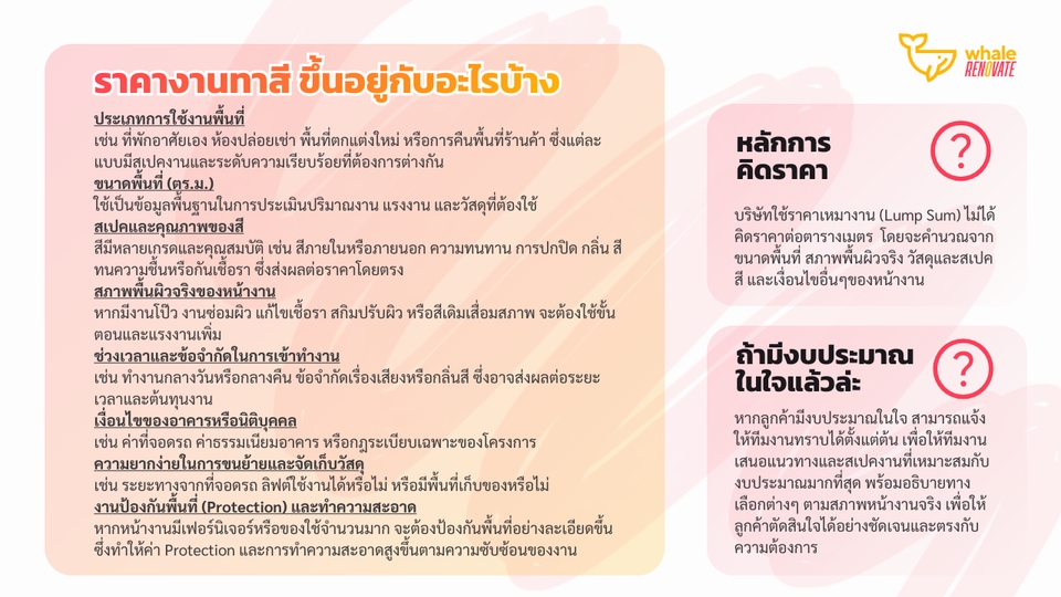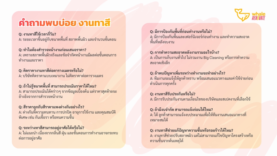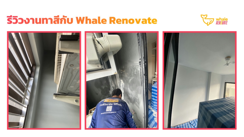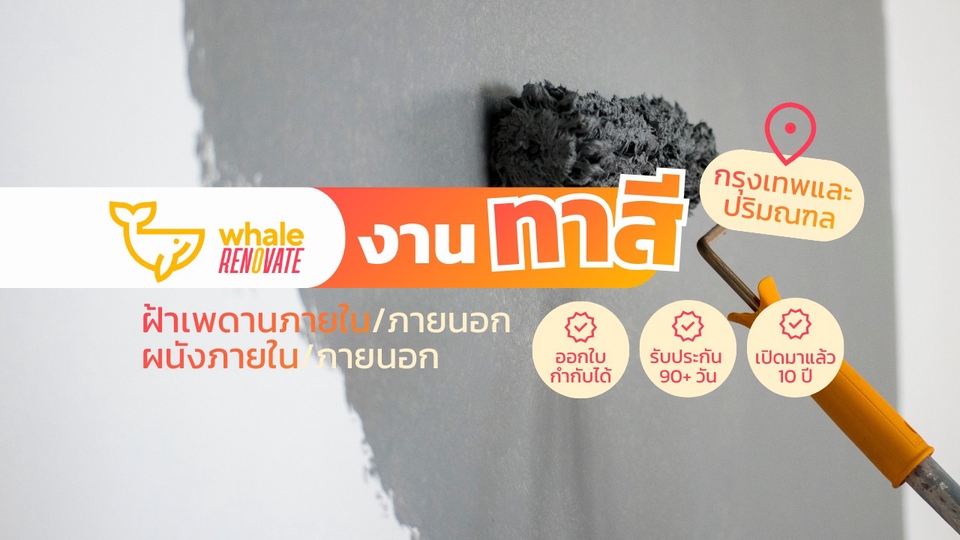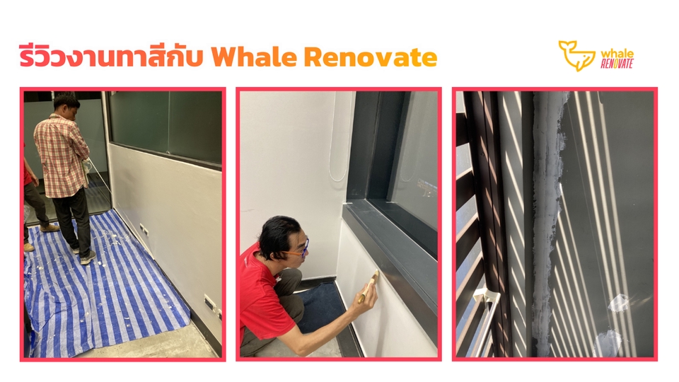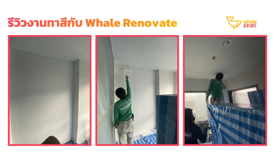 บริการทาสีผนังหรือฝ้าเพดาน ดูแลได้ทั้งสีภายในและสีภายนอก ค่าบริการจะขึ้นอยู่กับขนาดของพื้นที่ที่ต้องกาทาสี รวมถึงการเก็บโป๊ว สกิม ขัด รอยแตกต่างๆที่อาจจะมีอยู่บนพื้นผิวเก่า ลูกค้าสามารถส่งรูปหน้างานพร้อมวัดขนาดมาให้ทางทีมงานเพื่อประเมินราคาเบื้องต้นได้เลยค่ะ --------- เวล รีโนเวท ทำธุรกิจซ่อมบ้านและคอนโดมากว่า 10 ปี - ซื่อสัตย์ ไม่ลดสเปค ไม่ทิ้งงาน - มีทีมงานดูแล ไม่ต้องคุยกับช่างโดยตรง (ลดปัญหาการทะเลาะกับช่าง) - รับประกันงานทุกงานที่จ้างผ่านบริษัท --------- ขั้นตอนการทำงาน 1. เลือกบริการผ่าน Fastwork 2. ทักแชทส่งรายละเอียดงาน ที่อยู่ปักหมุด และเบอร์ติดต่อกลับ 3. ทีมงานส่งปรึกษาช่างและติดต่อลูกค้ากลับเพื่อคอนเฟิร์ม (บางงานทางบริษัทไม่ได้รับค่ะ) 4. ทำนัดเข้าสำรวจหน้างานเพื่อรับบรีฟและดูรายละเอียดงานจริง 5. ลูกค้าชำระเงินผ่าน Fastwork 6. ทีมงานเข้าสำรวจหน้างานและรับบรีฟ 7. ทีมงานทำรายละเอียดและเสนอราคางานทั้งหมดให้พิจารณา 8. ลูกค้าชำระเงิน 9. ทีมช่างเข้าให้บริการ 10. งานจบลูกค้าตรวจสอบ และชำระเงินที่เหลือ (หากมี) 11. แอดมินส่งปิดงานในระบบ Fastwork ---------