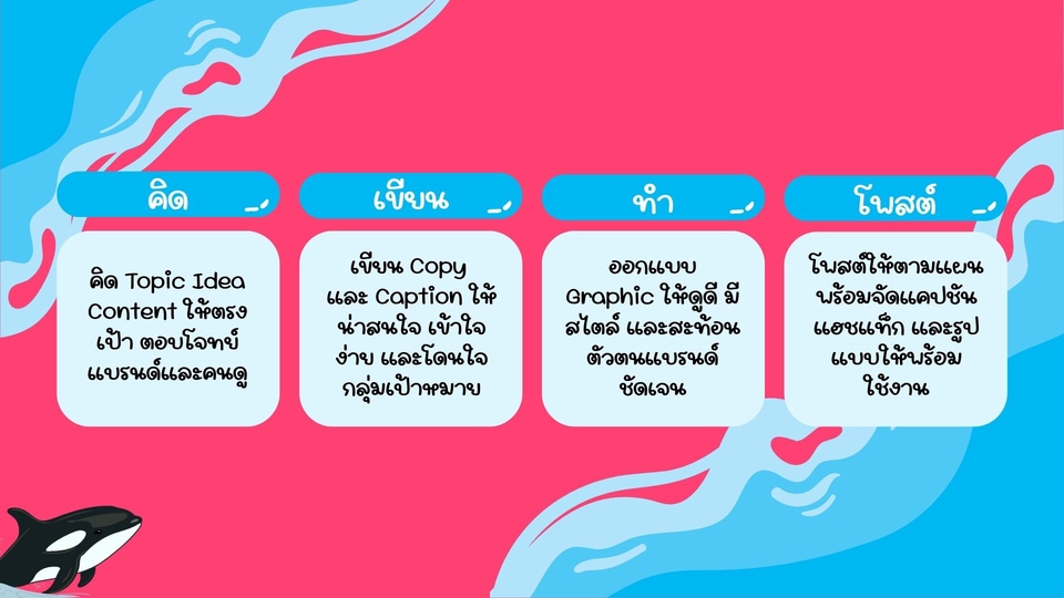 คิดได้ เขียนได้ บรีฟก็ได้ — คอนเทนต์แบบไหนก็ลุย 🐳ครีเอทีฟคอนเทนต์ที่เก็บครบ ทั้งการคิด Topic Idea, ออกแบบบรีฟสำหรับนำไปทำ AW หรือเขียน Script และ Storyline 🐳พร้อมลุยทุกแพลตฟอร์ม ไม่ว่าจะเป็นโพสต์โซเชียลหรือวิดีโอคอนเทนต์ในช่องทางต่าง ๆ