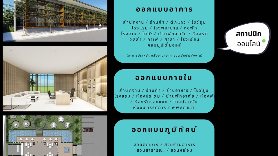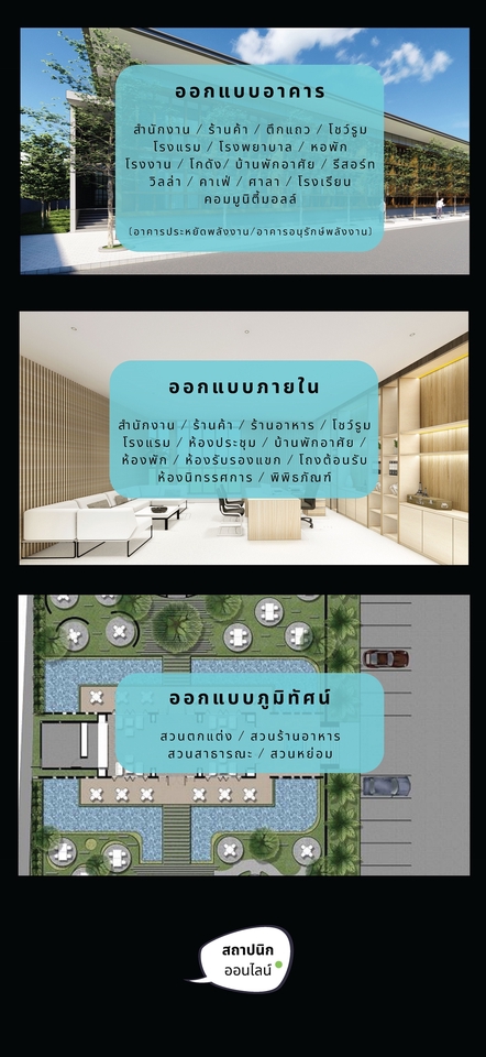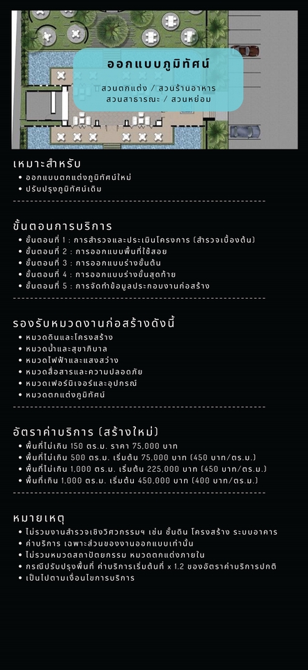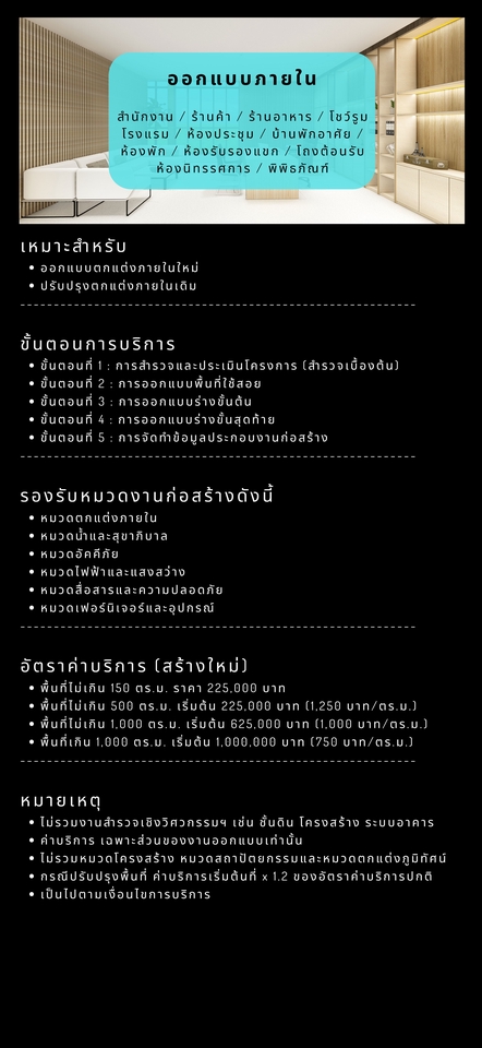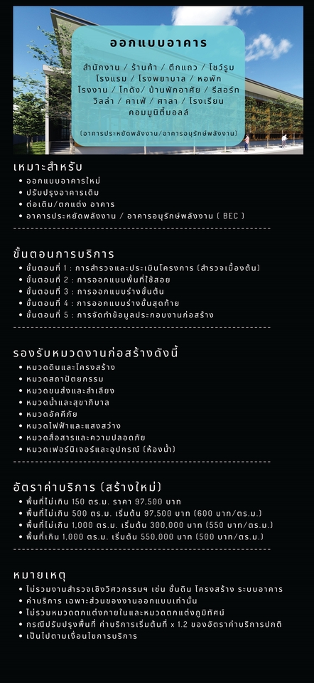 เหมาะสำหรับ - ออกแบบอาคารใหม่ / ตกแต่งภายใน / ตกแต่งสวน ภูมิทัศน์ - ปรับปรุงอาคารเดิม / ตกแต่งภายใน / ตกแต่งสวน ภูมิทัศน์ - ต่อเติม/ตกแต่ง อาคาร - อาคารประหยัดพลังงาน - อาคารอนุรักษ์พลังงาน ( BEC ) --------------------------------------- ขั้นตอนการบริการ ขั้นตอนที่ 1 : การสำรวจและประเมินโครงการ (สำรวจเบื้องต้น) ขั้นตอนที่ 2 : การออกแบบพื้นที่ใช้สอย ขั้นตอนที่ 3 : การออกแบบร่างขั้นต้น ขั้นตอนที่ 4 : การออกแบบร่างขั้นสุดท้าย ขั้นตอนที่ 5 : การจัดทำข้อมูลประกอบงานก่อสร้าง --------------------------------------- หมายเหตุ - ไม่รวมงานสำรวจเชิงวิศวกรรมฯ เช่น ชั้นดิน โครงสร้าง ระบบอาคาร - ค่าบริการ เฉพาะส่วนของงานออกแบบเท่านั้น - กรณีปรับปรุงพื้นที่ ค่าบริการเริ่มต้นที่ x 1.2 ของอัตราค่าบริการปกติ - เป็นไปตามเงื่อนไขการบริการ