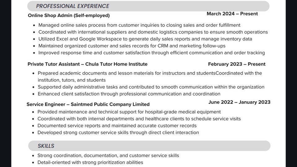 - ทักษะการประสานงาน การจัดทำเอกสาร และการบริการลูกค้าที่แข็งแกร่ง - ใส่ใจในรายละเอียดและมีความสามารถในการจัดลำดับความสำคัญได้ดี - เรียนรู้เร็ว มีทัศนคติเชิงบวก และมีจิตวิญญาณของทีม - ทักษะความสัมพันธ์ระหว่างบุคคลที่ดีและการทำงานร่วมกันเป็นทีม - มีความรับผิดชอบ อดทน และทุ่มเท - กระตือรือร้นที่จะเรียนรู้และปรับปรุงอย่างต่อเนื่อง