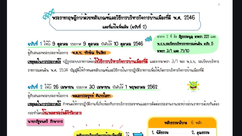 ไฟล์ สรุป พรบ. 6 ฉบับ 1. พระราชบัญญัติระเบียบบริหารราชการแผ่นดิน พ.ศ.2534และที่แก้ไขเพิ่มเติม 2. พระราชกฤษฎีกาว่าด้วยหลักเกณฑ์และวิธีการบริหารกิจการบ้านเมือง พ.ศ.2546 และแก้ไขเพิ่มเติม (ฉบับที่2) 3. พระราชบัญญัติวิธีปฎิบัติราชการทางปกครอง พ.ศ. 2539 และที่แก้ไขเพิ่มเติม (2ฉบับ) 4. ประมวลกฎหมายอาญา พ.ศ.2499 (ความผิดต่อตำแหน่งหน้าที่ราชการ) 5. พระราชบัญญัติความรับผิดทางระเมิดของเจ้าหน้าที่ พ.ศ.2539 6. พระราชบัญญัติมาตรฐานทางจริยธรรม พ.ศ.2562 โดยในไฟล์สรุปจะเน้นสีสันสดใส เพิ่มความน่าสนใจและน่าอ่านมากขึ้น